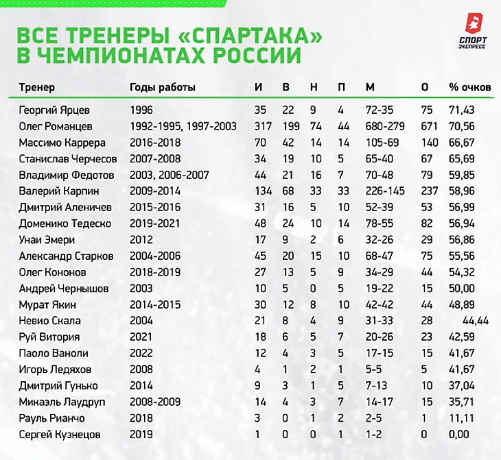Почти по всем основным показателям среди специалистов, возглавлявших «Спартак», лидирует Олег Романцев. И только по проценту очков его немного превзошел Георгий Ярцев.