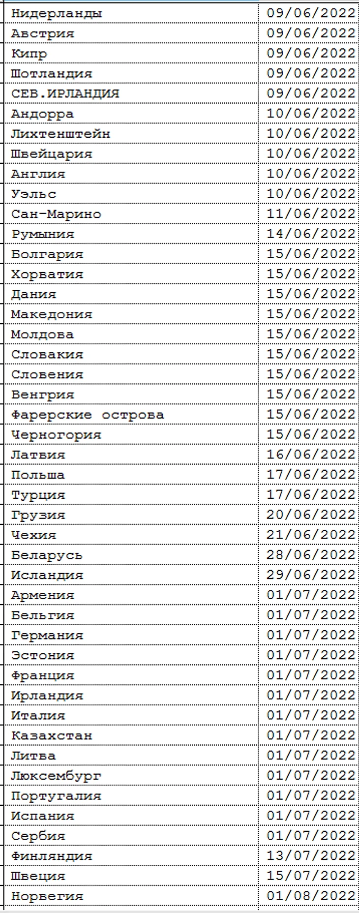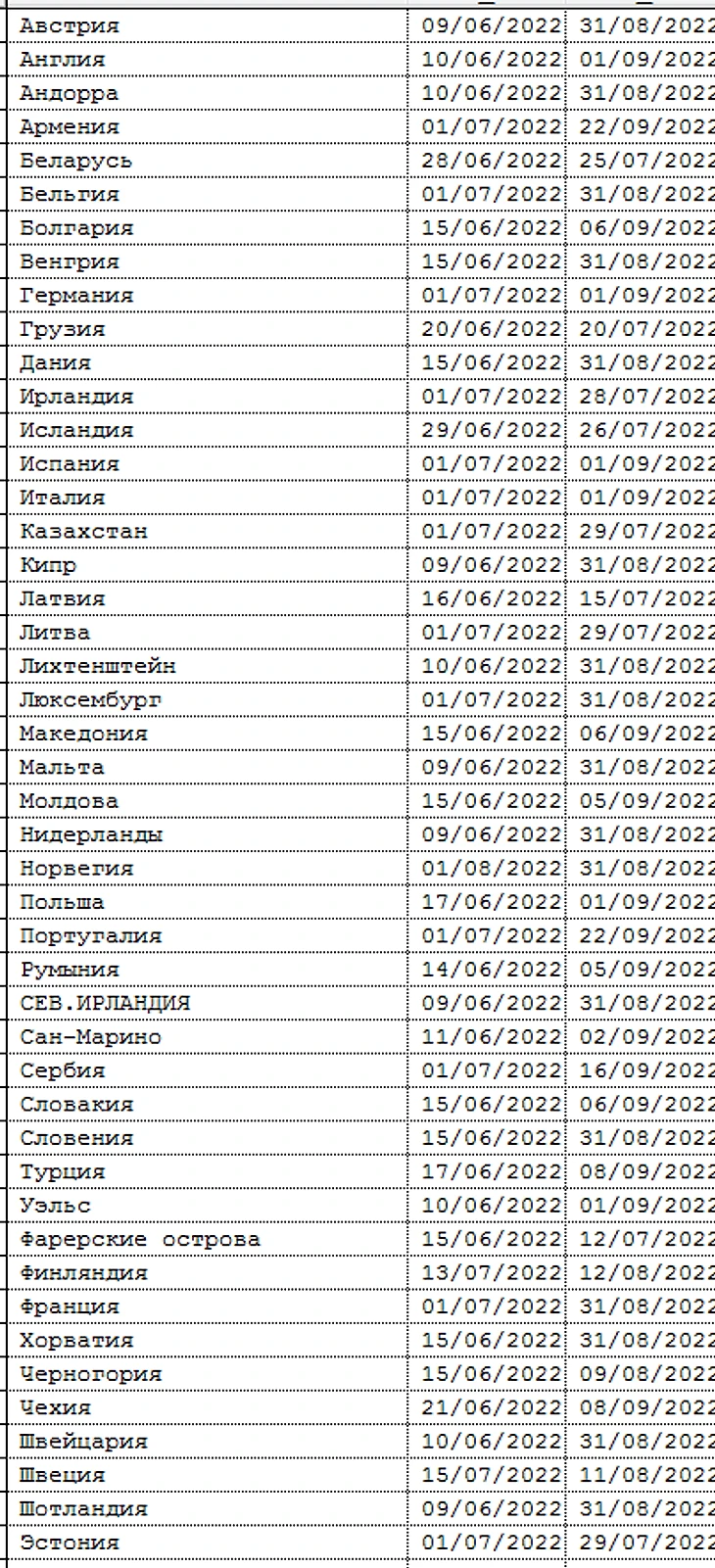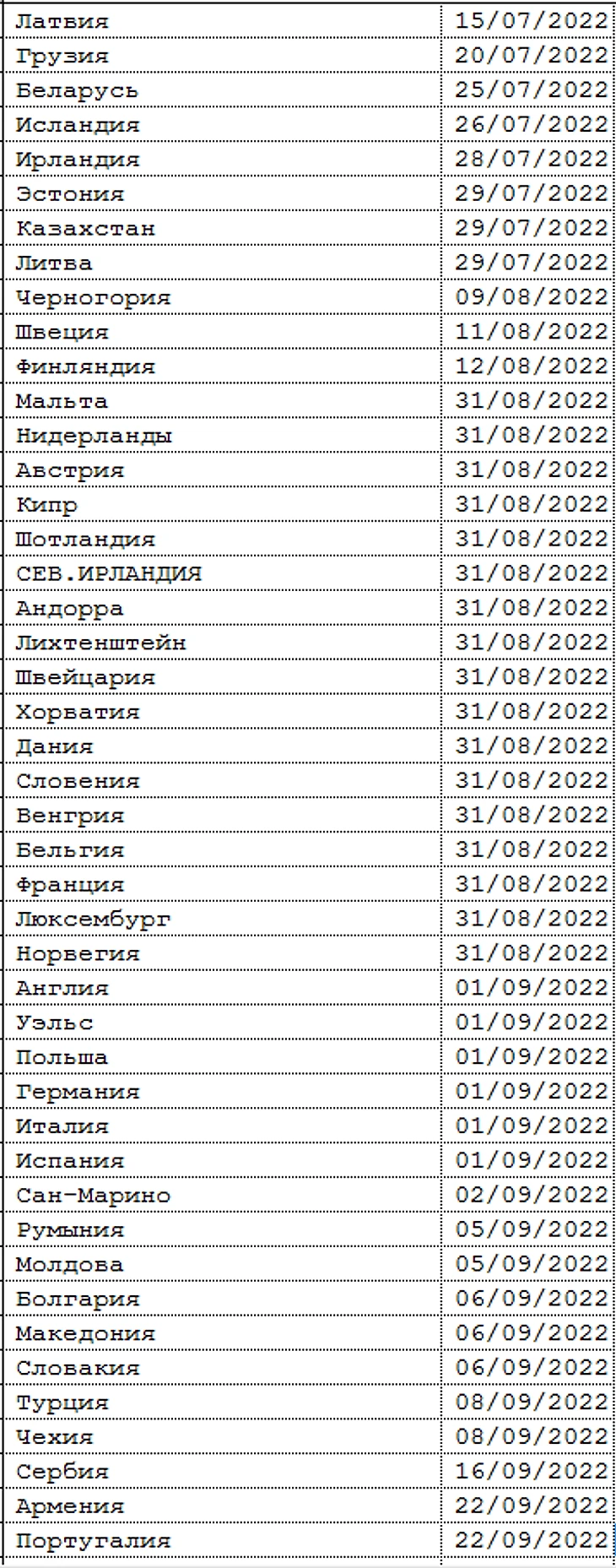 Сроки начала и окончания летних трансфертных окон у стран Европы.