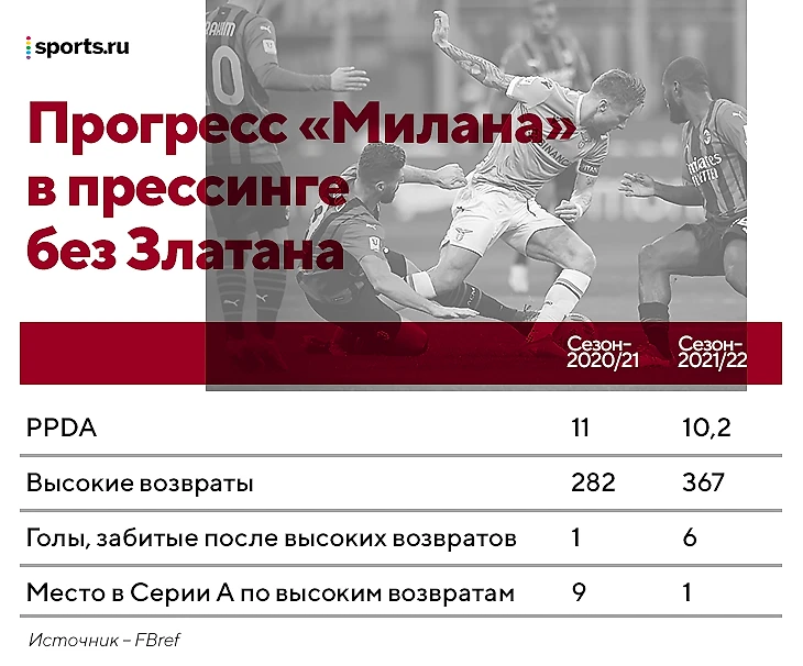 Еще заметнее улучшилась стадия без мяча. С тех пор как Златан осел на скамейке, «Милан» пропустил всего 6 голов в 16 матчах. Всего за сезон команда забила в 6 раз больше голов благодаря высоким возвратам, чем год назад, на треть увеличила количество отборов в атакующей трети и значительно прибавила в интенсивности прессинга. Высокое давление стало гибче и агрессивнее: миланцы выросли не только в количестве, но и в качестве – жонглируют зонным и персональным прессингом в зависимости от соперника.