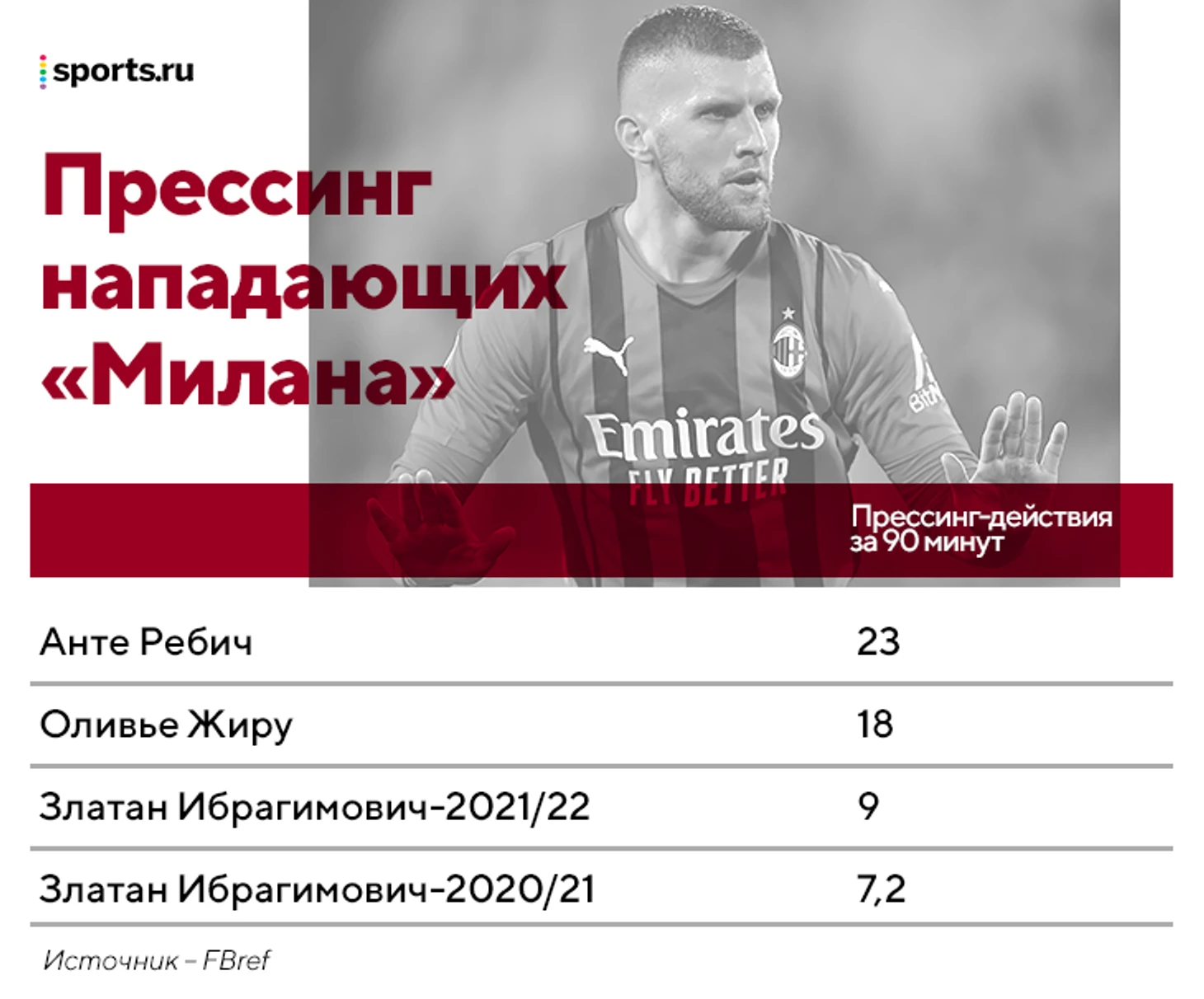 Кроме того, разницу сделали и индивидуальные качества. Златану скоро 41, а он и в лучшие годы воевал с Гвардиолой из-за неспособности поддерживать прессинг. Жиру и тем более Ребич намного активнее. Даже 35-летний француз прессингует в два раза чаще шведа. Ребич и вовсе один из самых активных атакующих игроков Серии А в стадии без мяча.