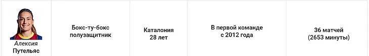 Хедлайнер сезона. В свой первый год в качестве капитана команды она была её лидером, её олицетворением. По сравнению с прошлым сезоном, по итогам которого она выиграла «Золотой мяч», Алексия улучшила свою статистику, до уровня нападающего: 34 забитых мяча и 20 результативных передач. Путельяс всегда проявляет себя в больших играх.