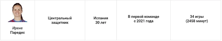После выдающегося сезона в ПСЖ, она стала звездой уже в составе «Барсы». Паредес быстро адаптировалась, и команда приобрела не только солидность и надёжность в обороне, но и стала более опасной у чужих ворот на стандартах.