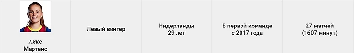 Голландка весь сезон провела на топ уровне. Она доказала, что является лучшим игроком на своей позиции и умеет делать разницу. Её отсутствие в финале ЛЧ было заметным. К сожалению, Лике решила не продлевать контракт с командой и переходит в ПСЖ. Это очень серьёзная потеря, хотя «Барселона» имеет хорошую глубину состава.