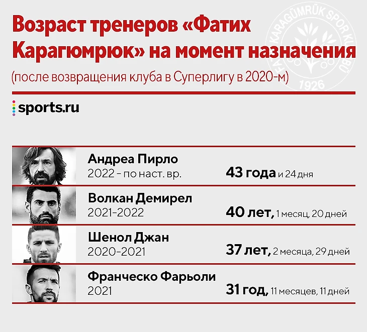 «Карагюмрюк» же в очередной раз поверил в начинающего специалиста. Удивительно, но Пирло будет самым возрастным тренером клуба после возвращения в Суперлигу. Более того, его соотечественник Фарьоли на момент подписания контракта был самым молодым тренером в профессиональных лигах Европы.