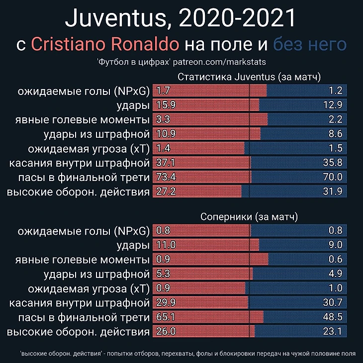 Несмотря на явное положительное влияние на атаку, с обороной и прессингом все не так хорошо - с португальцем, Юве совершает на 5 высоких оборонительных действий меньше, чем без него (на 15% хуже) и допускает больше моментов.