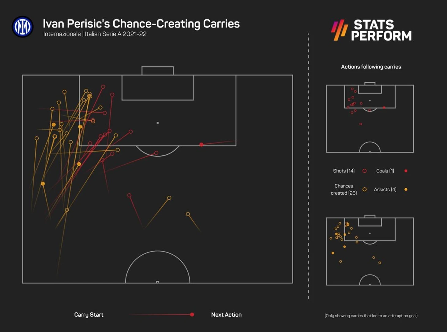 еришич создал 26 моментов после того, как долго протаскивал мяч. Это лучший показатель в топ-5 лигах Европы в прошедшем сезоне, если брать позицию Перишича. Если брать вообще все позиции, то уступает только Винисиусу, Сен-Максимену и Эдегору (игроки атаки).