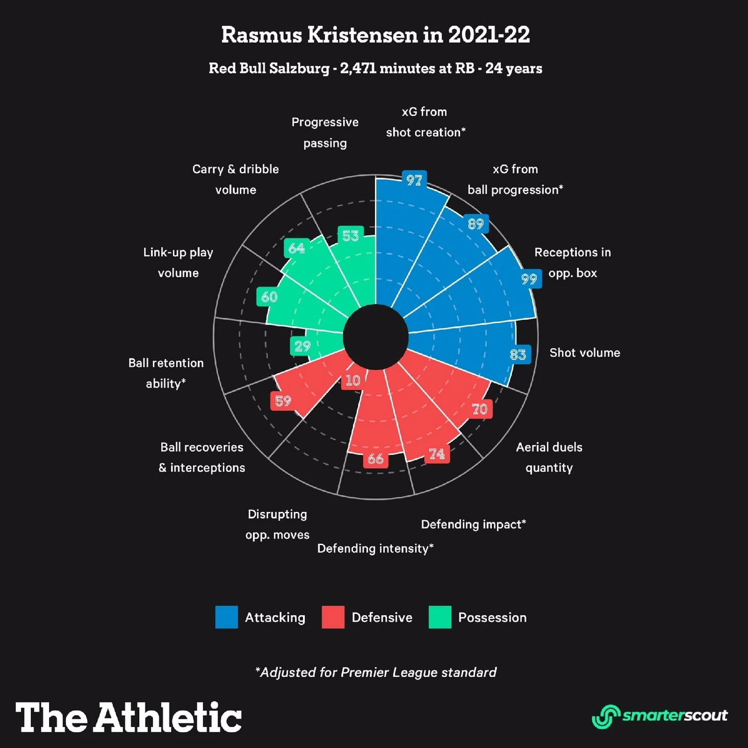 Очевидный уклон правого защитника на игру в атаке, при этом у датчанина вполне солидные показатели игры в обороне.