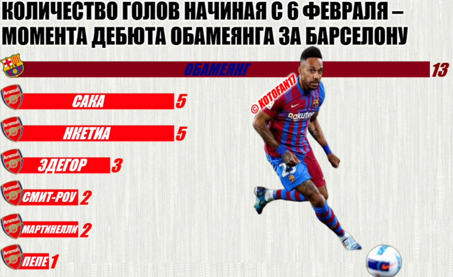 Я не поленился, сделал инфографику: за 3 с половиной месяца выступлений за Барселону, в которую габонец перешёл в январе, Обамеянг забил 13 голов – столько же сколько вместе взятые Сака, Нкетиа и Эдегор за этот же период.