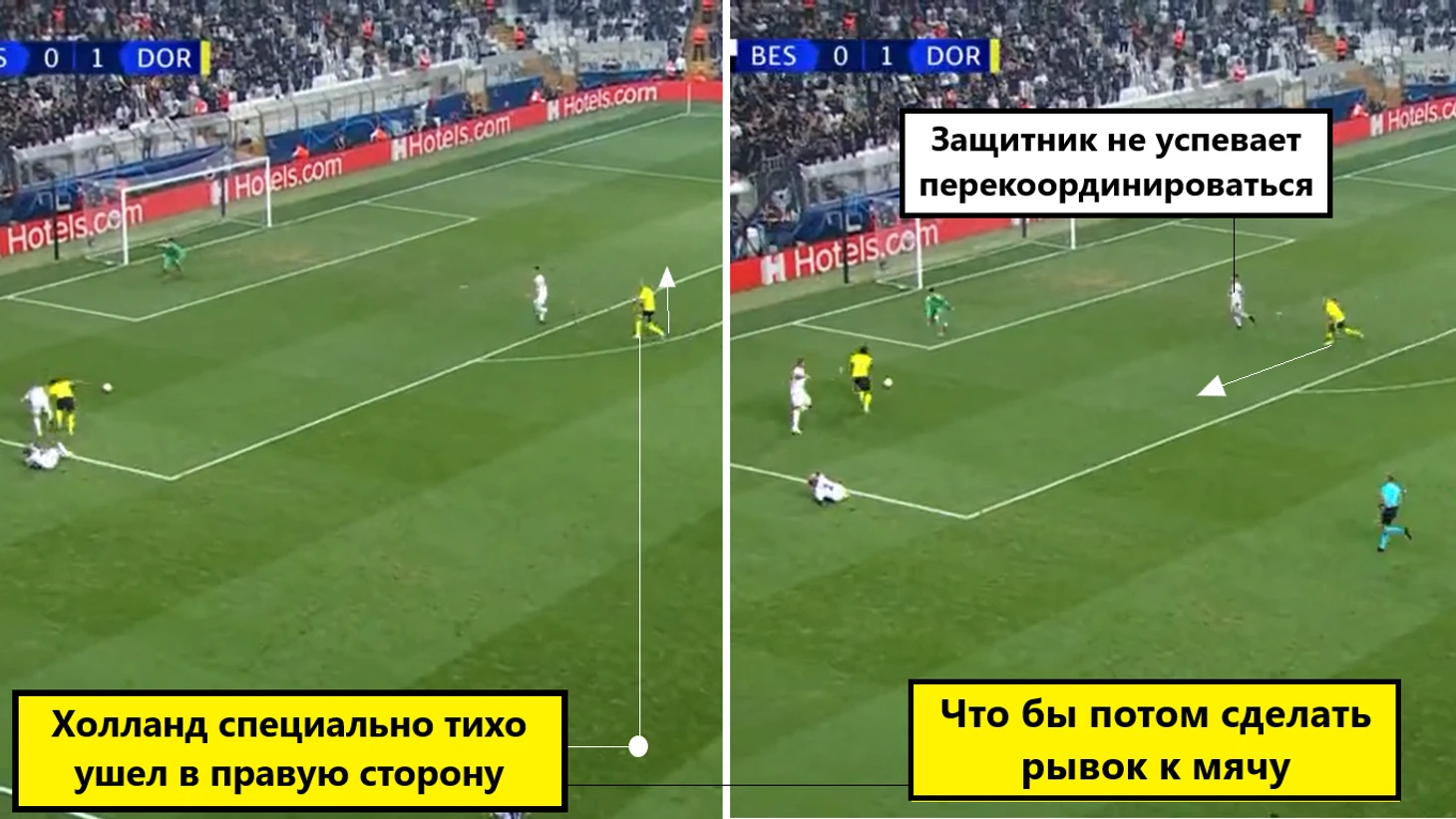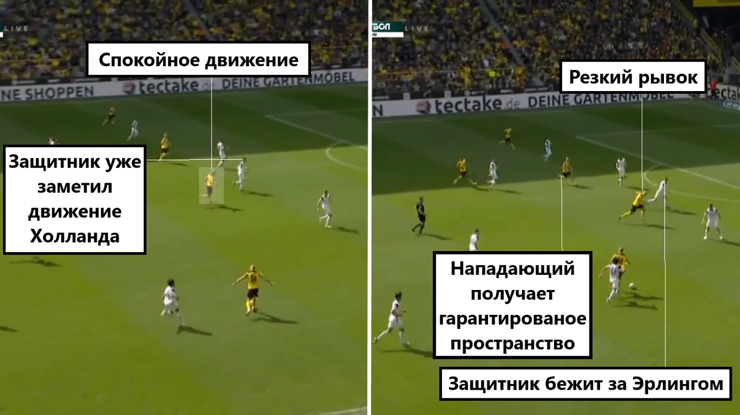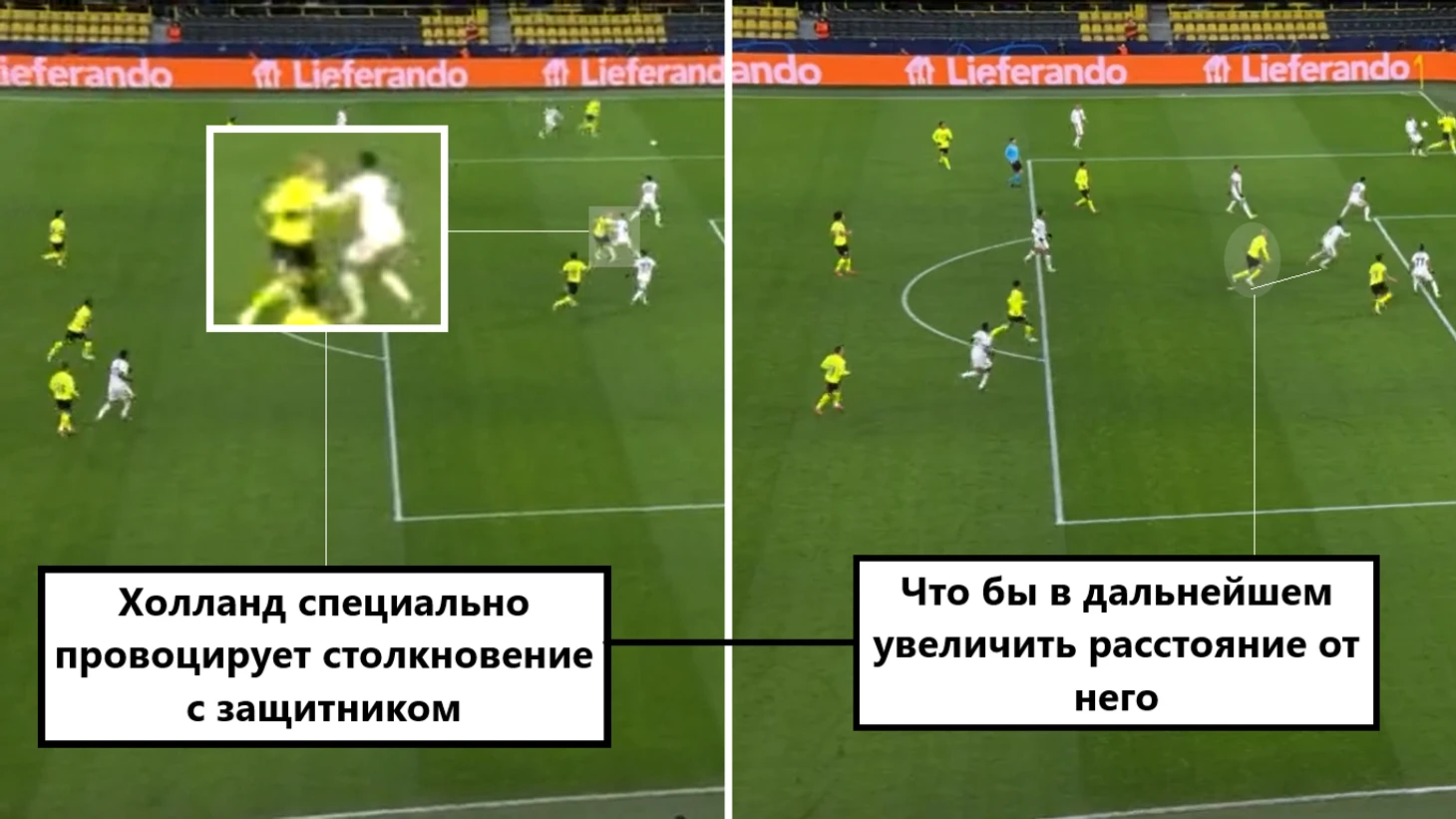 Это движение имеет много случаев использования, не только когда нужно выиграть себе пространство перед прострелом. Здесь, к примеру, мы видим как Холланд выигрывает пространство партнеру, а не себе, начиная забег в противоположную от нападающего сторону. После подобных моментов понимаешь, что проблемы в центре поля с пониманием розыгрышей у Эрлинге точно от недостатка ума.
