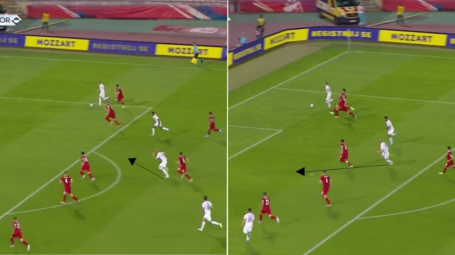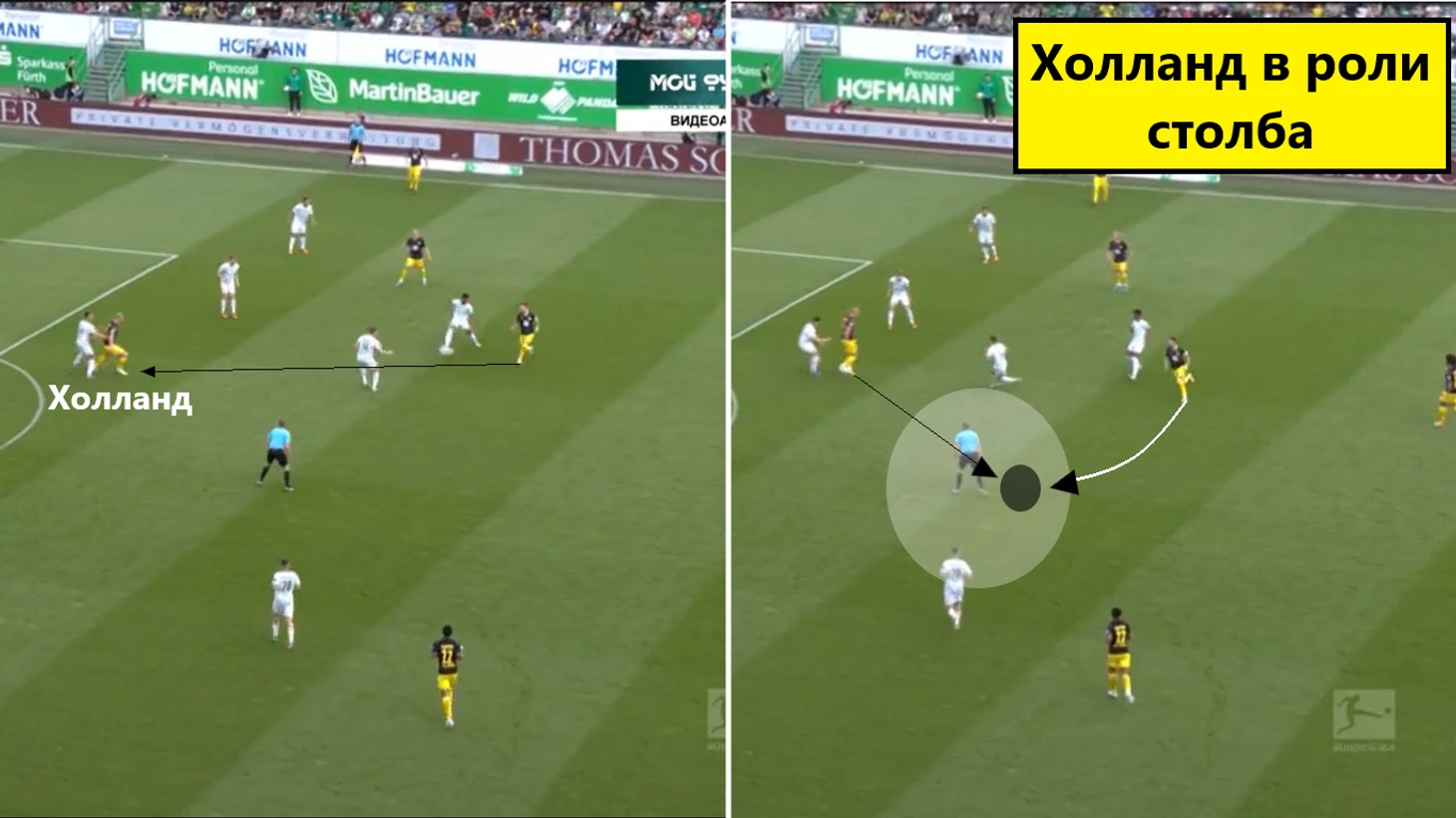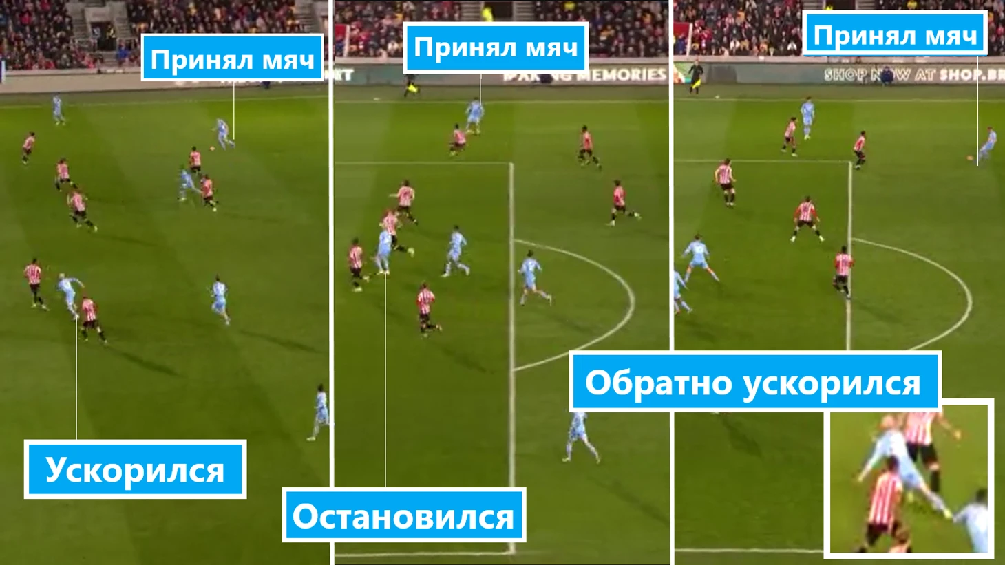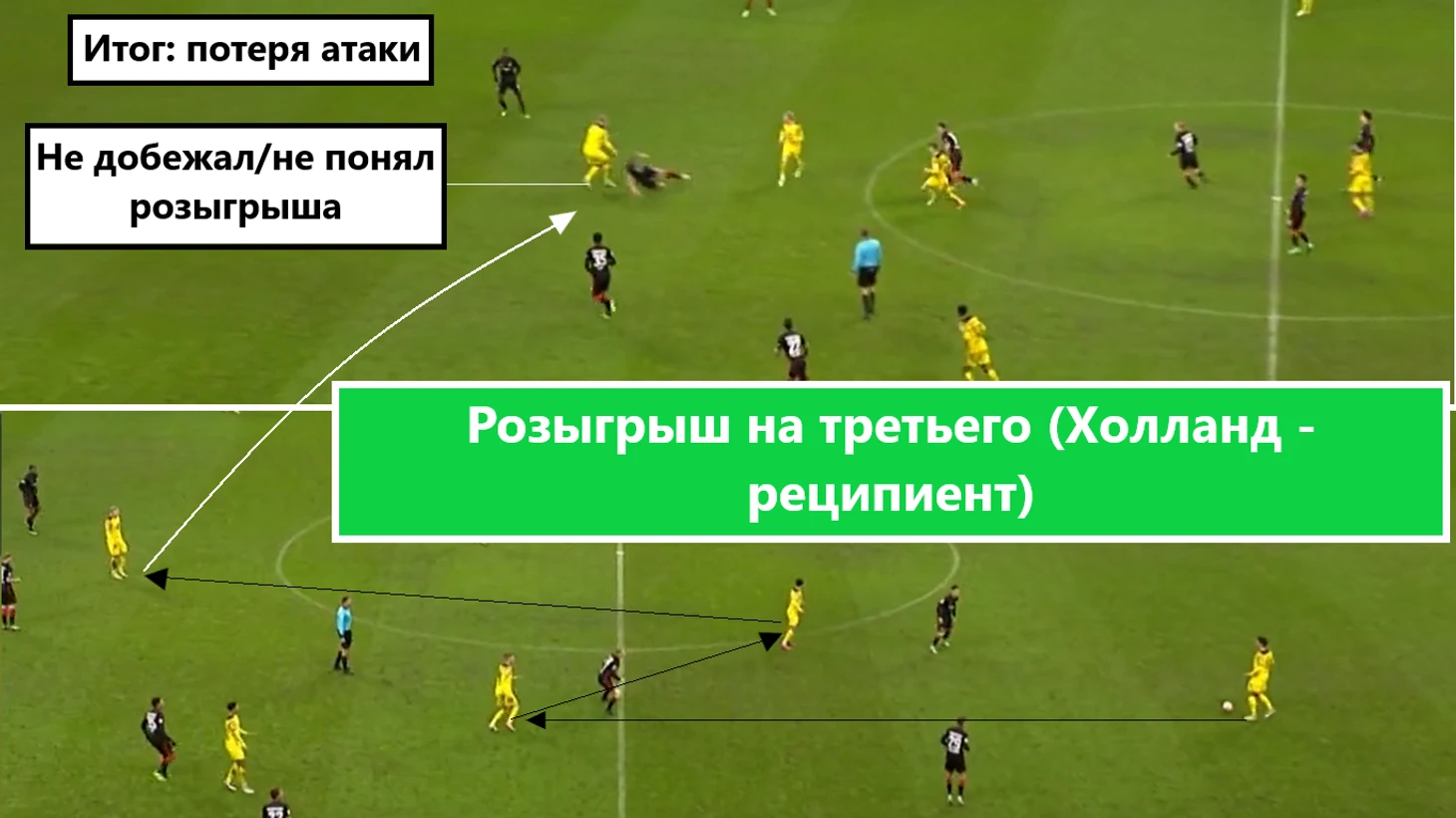 Это движение имеет много случаев использования, не только когда нужно выиграть себе пространство перед прострелом. Здесь, к примеру, мы видим как Холланд выигрывает пространство партнеру, а не себе, начиная забег в противоположную от нападающего сторону. После подобных моментов понимаешь, что проблемы в центре поля с пониманием розыгрышей у Эрлинге точно от недостатка ума.