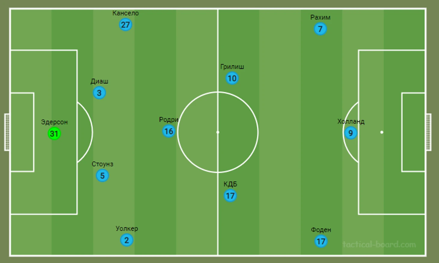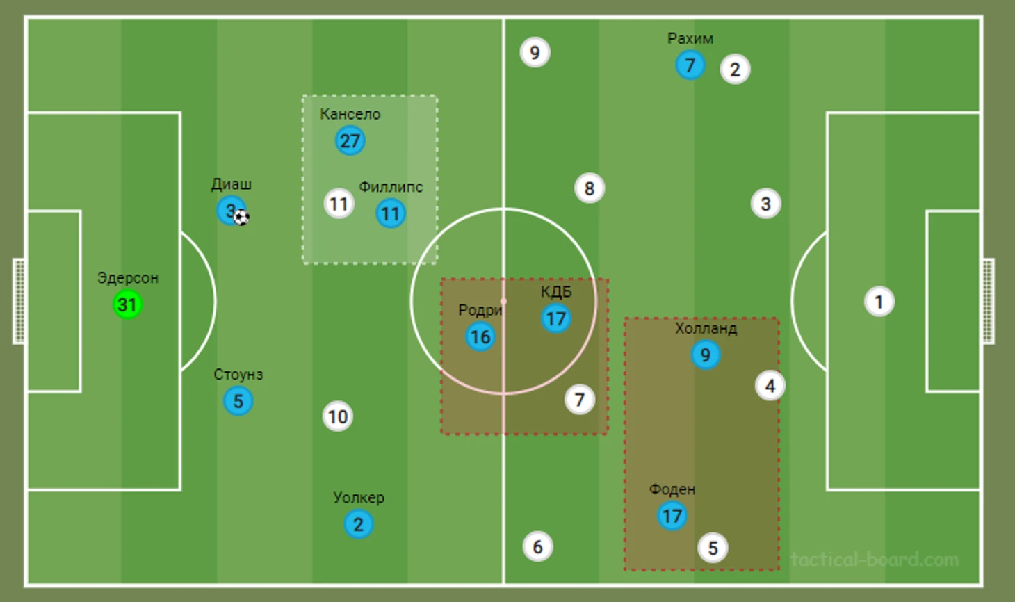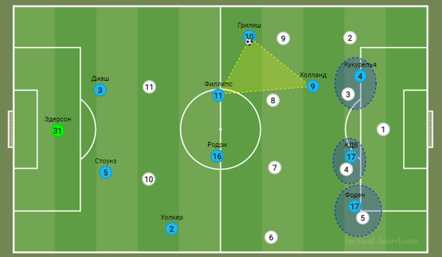 Самое прекрасное то, что трансфер Кукурельи спасает и Грилиша, а Пеп имеет крутую ротацию на левом фланге: нужна скорость и акцент на индивидуальное продвижение (например когда игра против более слабого соперника) – зовите Стерлинга, когда же нужна аккуратная организация игры – зовите Грилиша, который совместно с Холландом и Филлипсом создают треугольник в полупространстве, и тут уже множество вариантов вывода какого-либо игрока на позиции для введения мяча в штрафной.