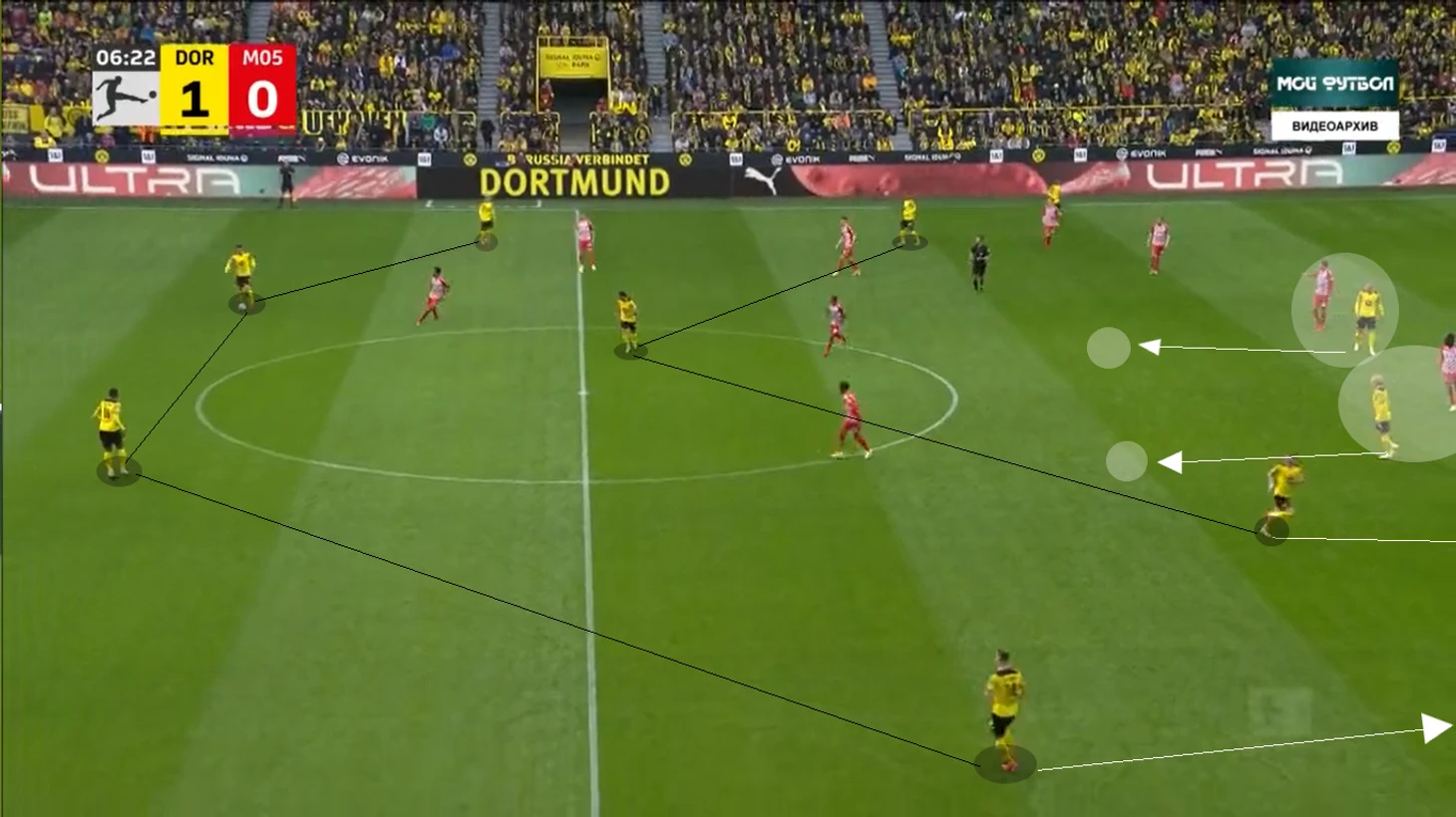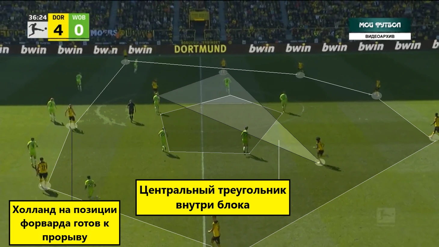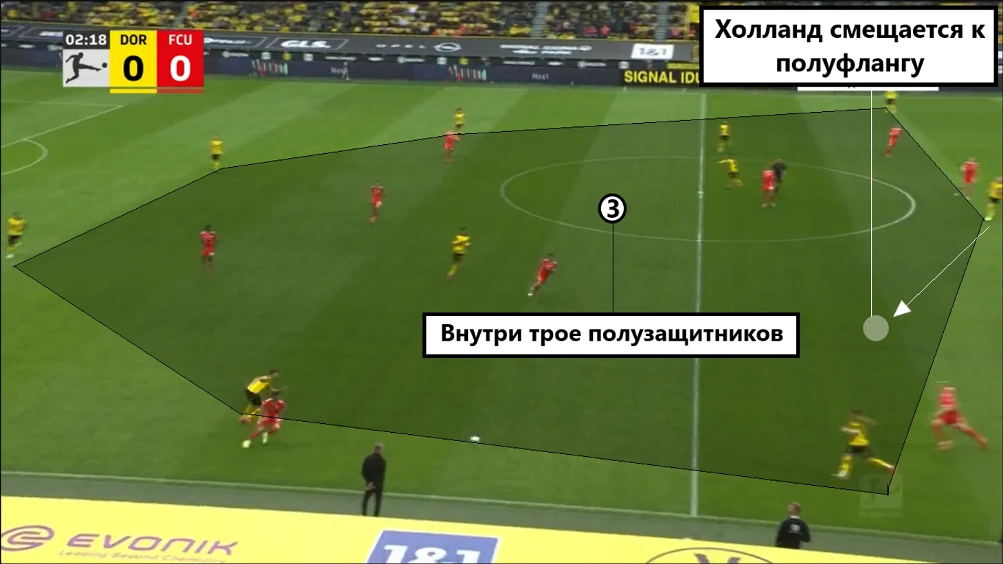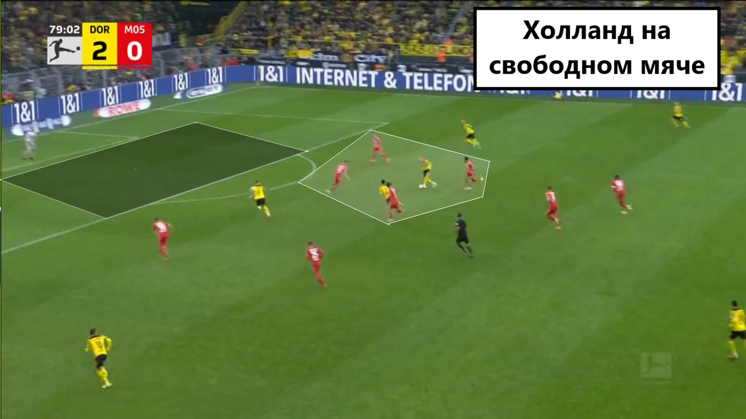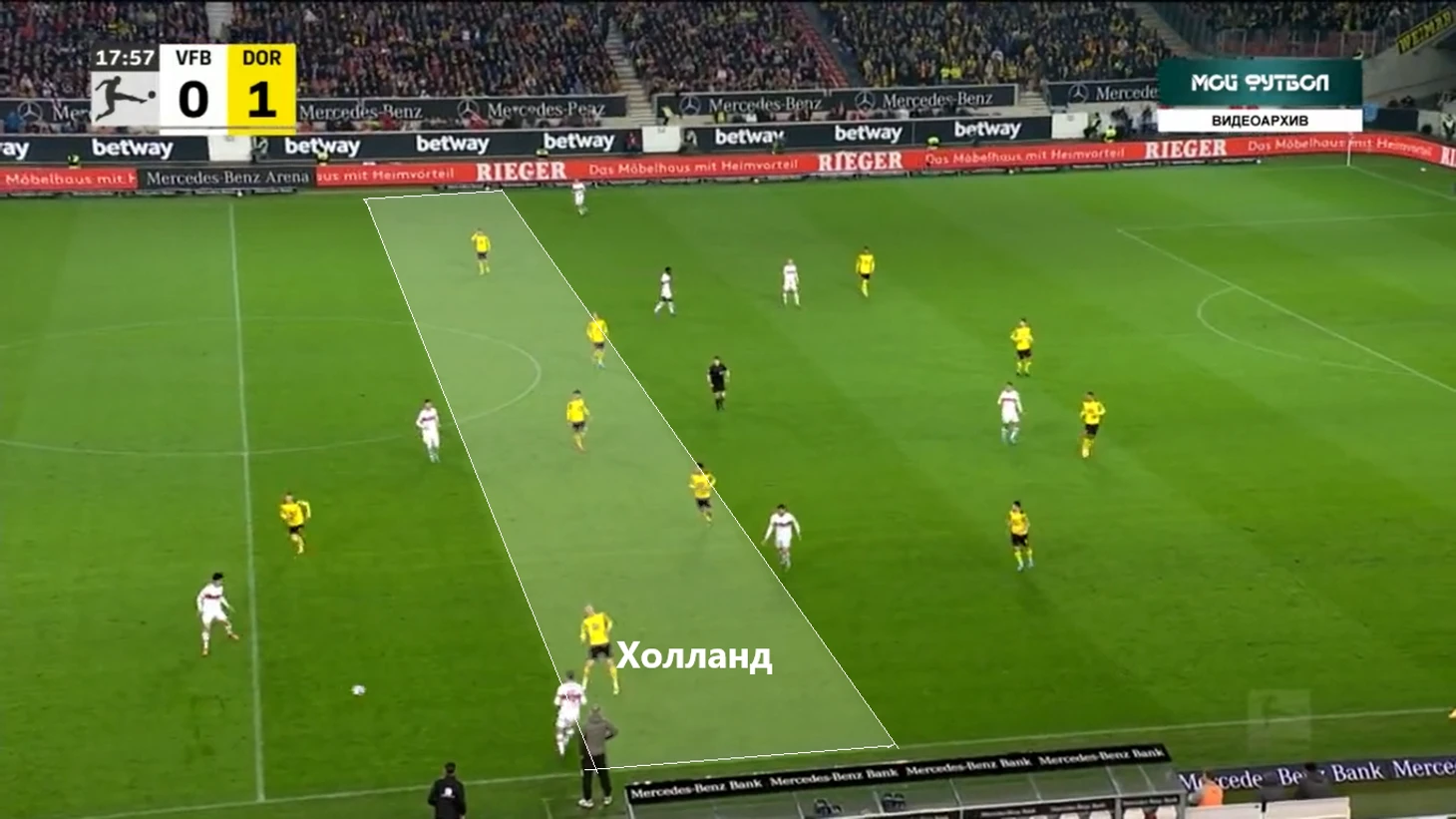 На иллюстрации абсолютно спокойная атака, имеющая низкий темп, но при этом еще и имеющая четкую широкую позиционную структуру. Обычная команда без Холланда, типа «Сити», просто начала бы набирать темп за счет многочисленных передвижений, но «Дортмунд» может позволить себе сделать заброс на наконечник, тем самым избавив себя от лишних хлопот. Так он, в итоге, и сделал.