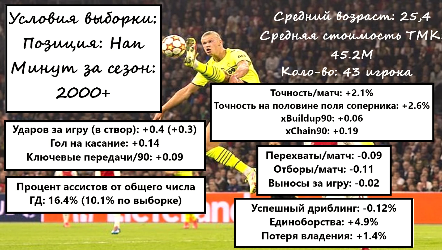 Из интересного можно отметить еще несколько тенденций: Холланд лучше форварда ТОП-лиг хорошего уровня почти во всем показателям (исключения: дриблинг, оборона), но существенно нападающий превосходит своих оппонентов по выборке мало в чем. Я полагаю, что в таком балансе и создается разница между Эрлингом и остальными – он, так скажем, собирает «с миру по нитке», тем самым в общей картине становясь абсолютным топом.