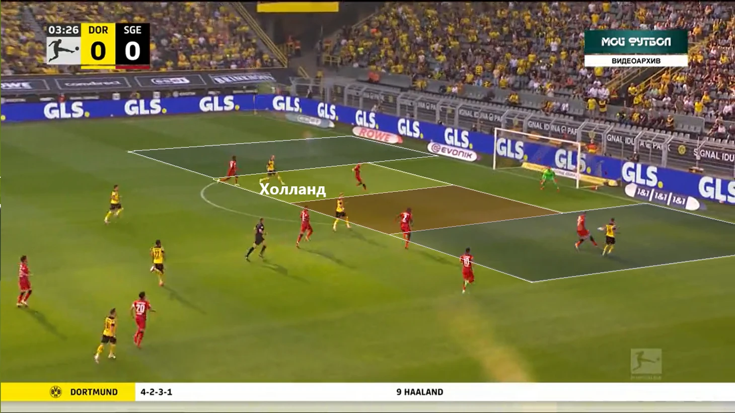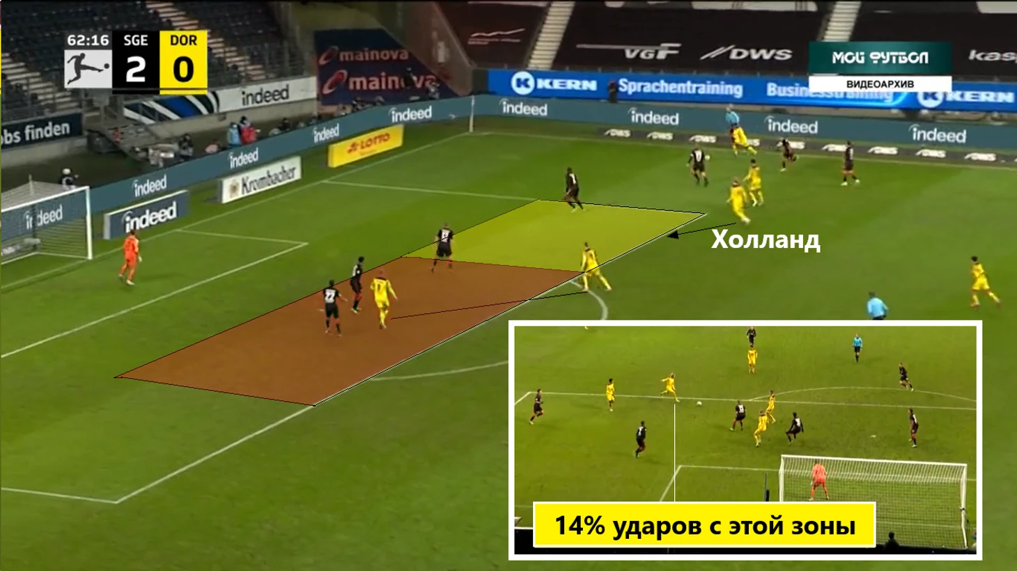 В своем очень сыром разборе Руррского дерби между «Шальке» и «Боруссией»я подмечал, что Холланд, как форвард полуфланга, нереально любит одну конкретную зону штрафной. Она отмечена желтым. Она для него идеальна во время подключения и потенциального приема мяча, или, как минимум, обострения ситуации в штрафной. Вообще, мне кажется, что Холланд как-то по своему делит зоны в штрафной. Примерно я себе представляю себе это так: