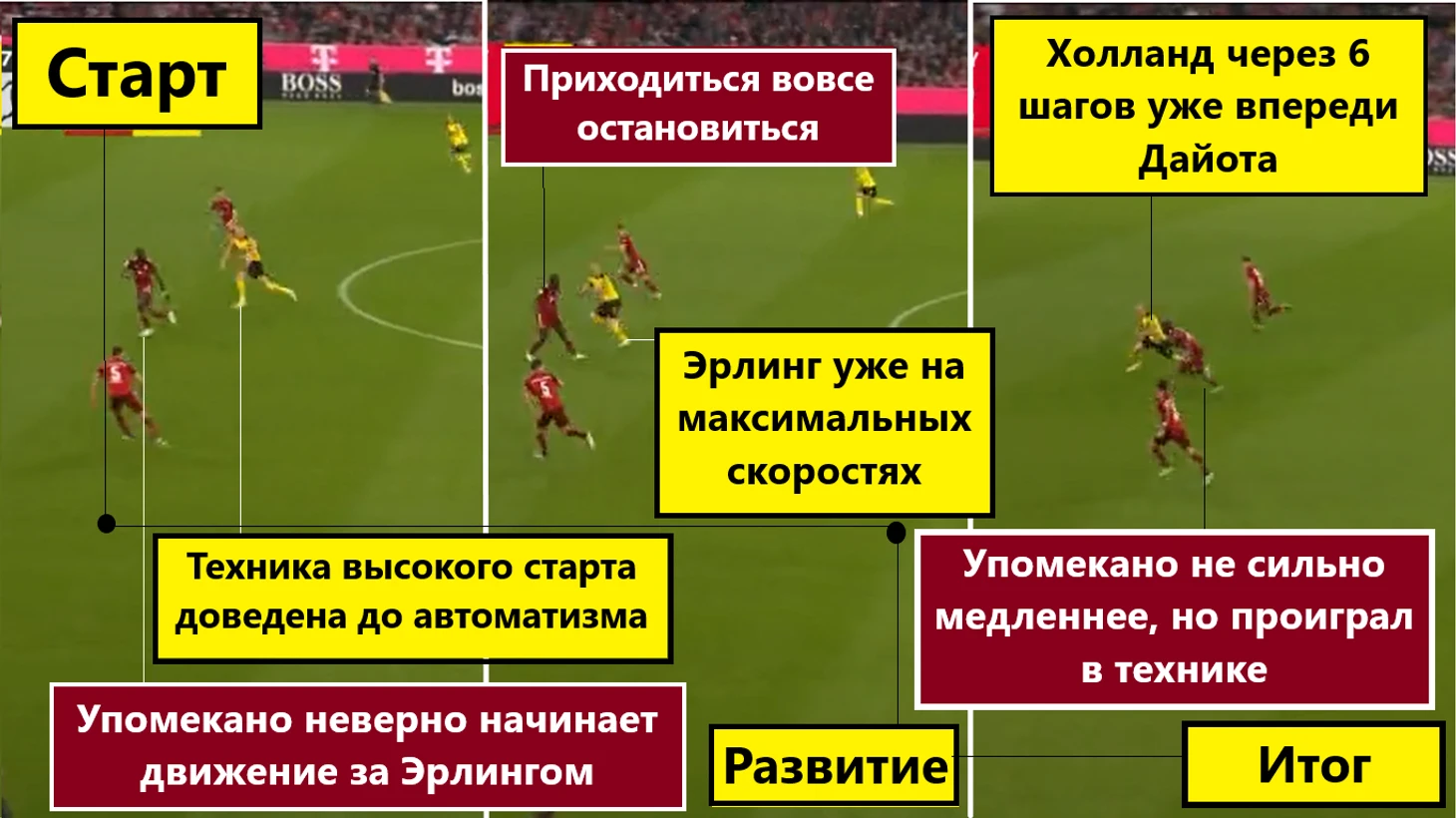 Тут детально расписано то, как Эрлинг ловит защитников с неразвитым чувством центра тяжести на мелких ошибках, и обгоняет их как ни в чем не бывало даже без того трюка, который я показывал выше.