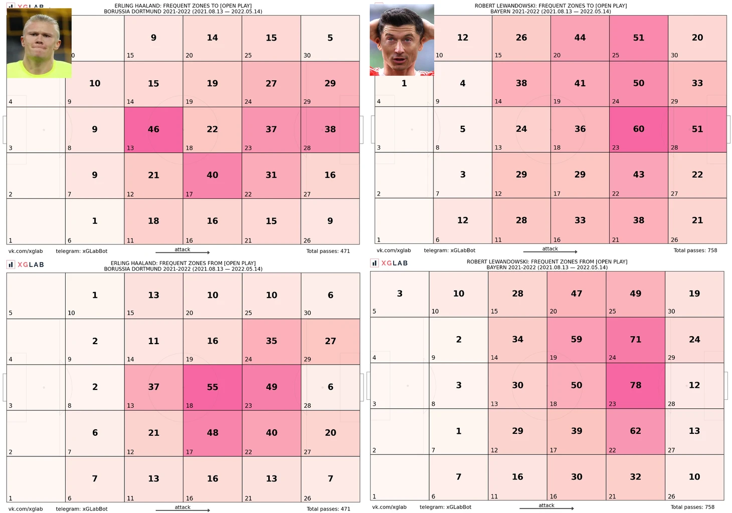 Сверху таблицы КУДА Лева и Холланд отдают передачи, снизу – ОТКУДА (xgLAB). Тут мы видим точно такую же тенденцию: Лева действует вдоль штрафной, Холланд – в глубь. Вот вам и вся разница между игроками.