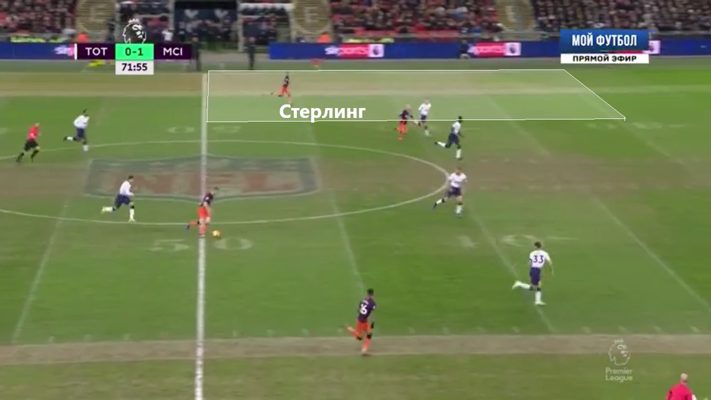 Сезон 18/19. АПЛ. «Тоттенхэм» - «Сити». В то время Стерлинг считался абсолютно топовым футболистом: 27 голевых действий только в Премьер-лиге. Вы можете посчитать это глупым сравнением, но Рахим крайне похож на Мюллера – он тоже абсолютно на 100% зависит от того, как хорошо он отыщет оптимальные для продвижения мяча зоны. Просто зоны они ищут абсолютно разные, и впоследствии пользуются ими абсолютно по-разному, подстраиваясь под свой функционал.