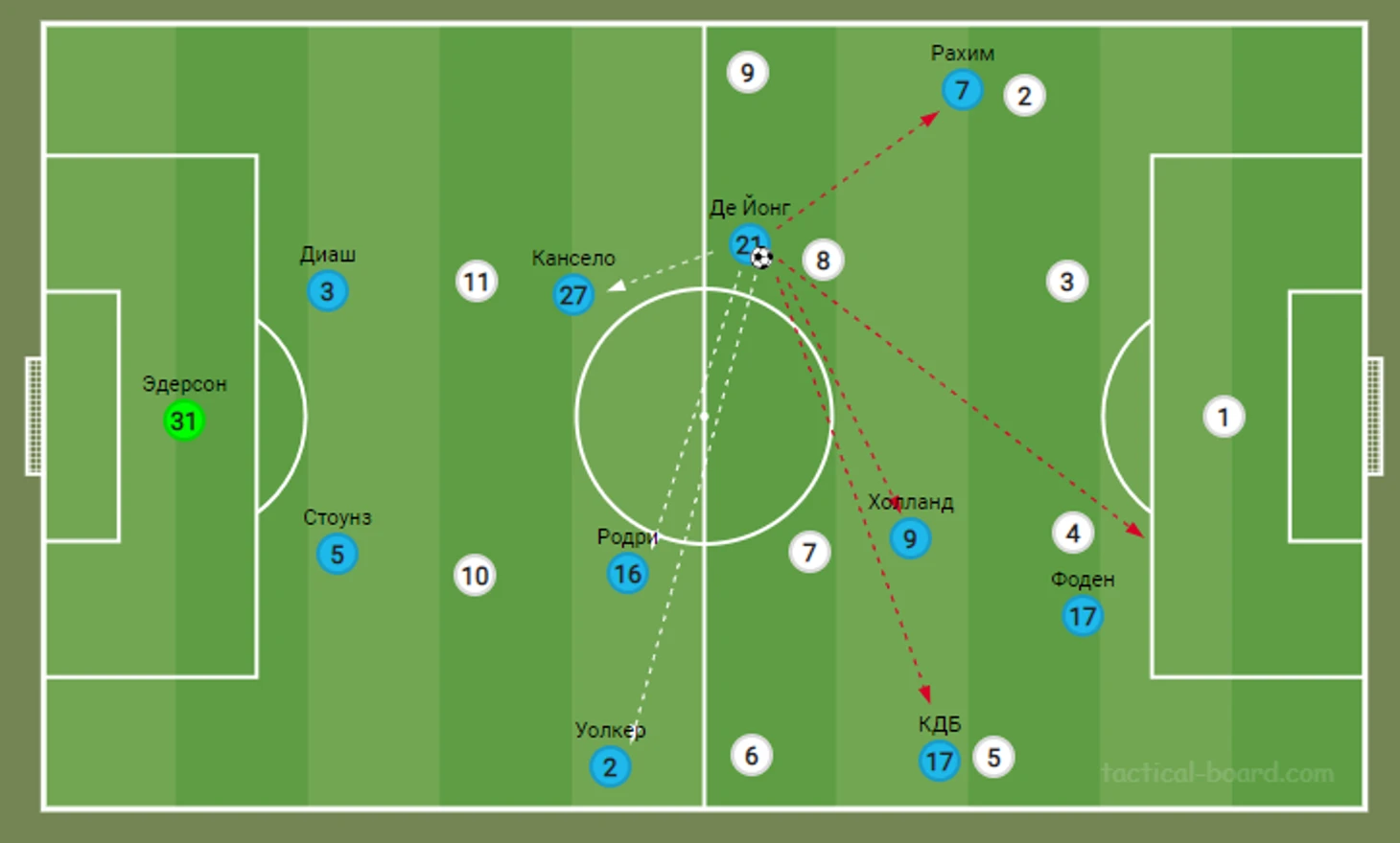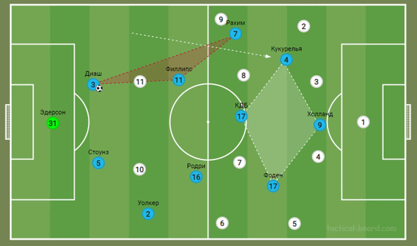 Кукурелья – тот футболист, который скорее будет уходить ближе к центру когда уже дойдет до финальной трети поля. Так получается, что Филлипс в своем любимом полупространстве, Стерлинг в фланговом треугольнике и скорее всего получает пространства на фланге, «Сити» получает импакт в атакующей линии, а Родри без структуры, абсолютно свободен, что ему на 100% подходит. Так один игрок и его одно простое движения дает абсолютно другую идею, абсолютно другую модель и приносит новые краски в команду.