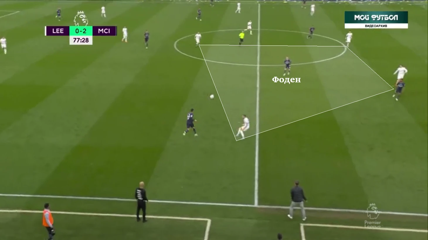 Фоден – мастер продвижения мяча в подобных ситуациях, когда имеет свободную зону в окружении соперника. Эта функция проявилась у игрока во всей красе в прошлом сезоне, когда там было максимально свободно: на позиции форварда играла ложная девятка, которая опускалась чисто по вертикали, оставаясь по центру, либо вовсе оставалась на своей позиции.