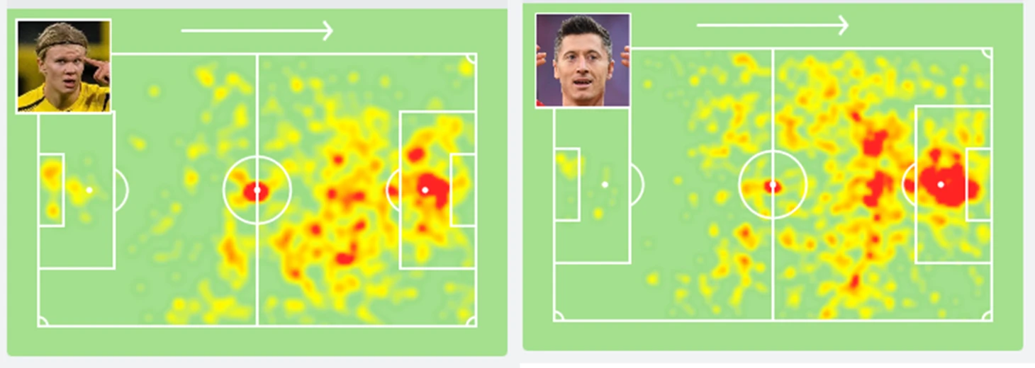 Для начала возьмем тепловую карту Холланда, и сравним ее с картой Роберта Левандовского. Просмотрев ее бегло, сложно заметить одно единственное, но такое важное отличие. У поляка мы видим концентрацию на трех зонах: в штрафной, перед штрафной (по всей ширине поля) и на левом фланге. У Холланда меньше акцент на своем рабочей, правом фланге (левша), и акцент направлен на правый ПОЛУФЛАНГ, куда он опускается и, судя по окрасу, влияет на атаки куда чаще поляка.