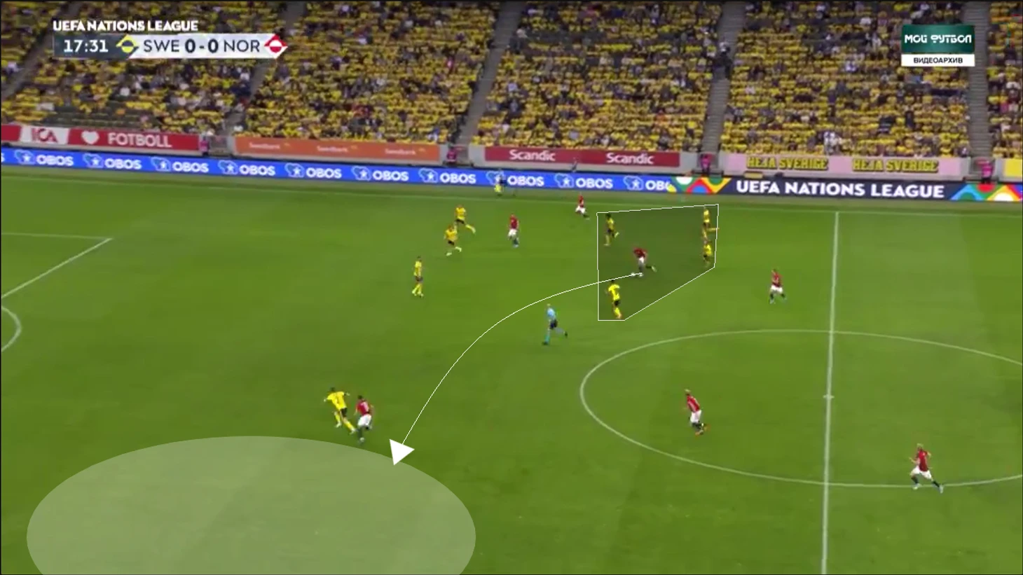 Но раз мы затронули тему системной игры, давайте рассмотрим вариант, когда норвежец не отыгрывает чистого наконечника, но и двигается более хитро. В нашей ситуации Эрлинг опускается вниз, видя, что: