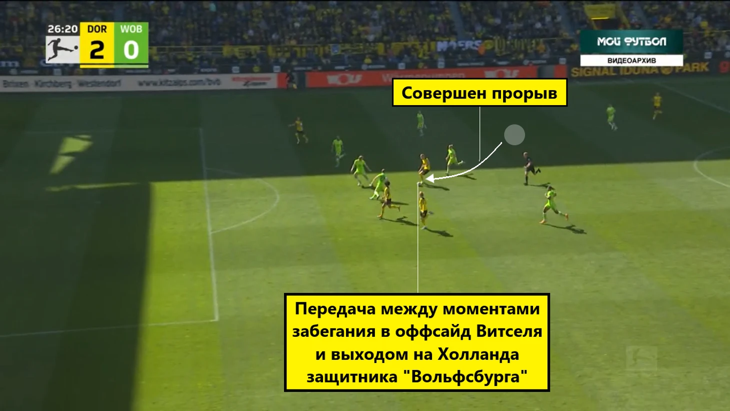 Еще доказательство того, что при надобности Эрлинг всегда выполнит тренерские установки. В этой ситуации судя по движению обоих наконечников Марко Розе дал четкое указание опускаться форвардам тогда, когда фланговые игроки начинают идти выше, для более высокой линии обороны соперника.