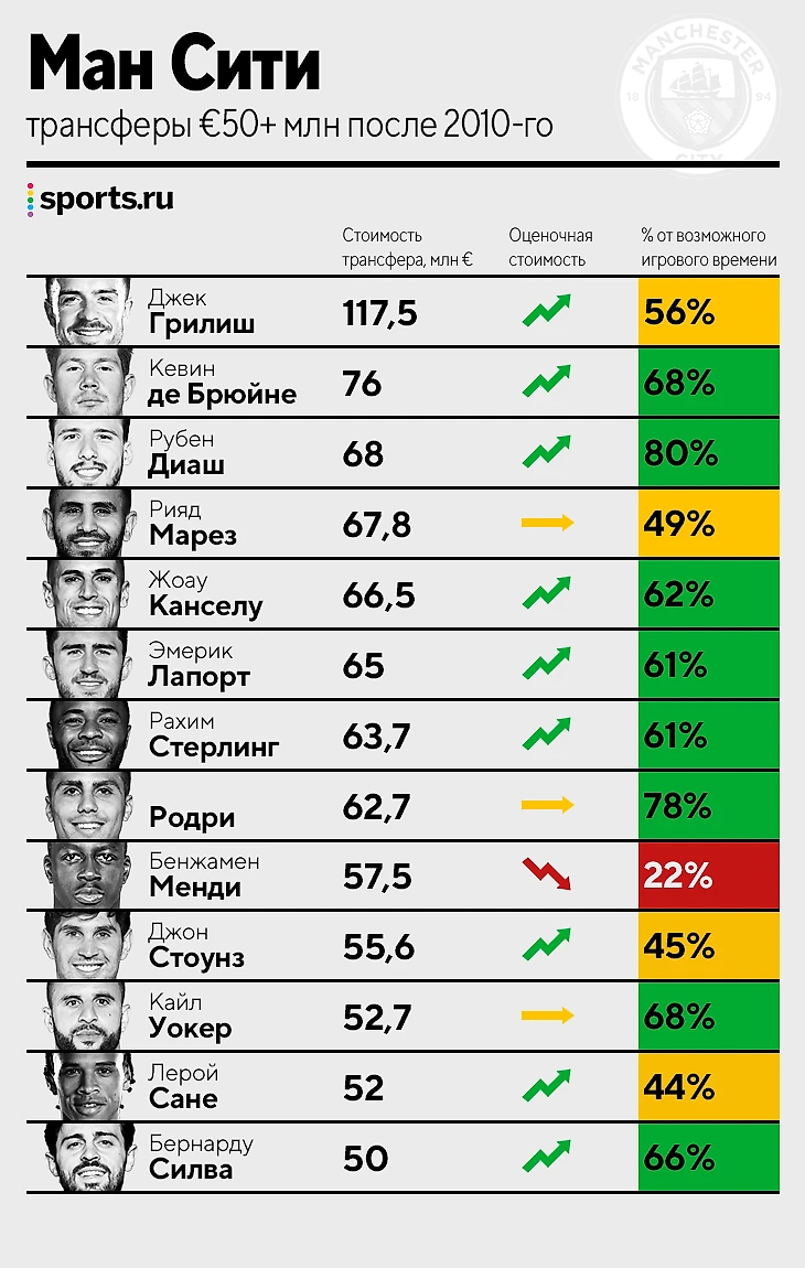 • К трансферам Де Брюйне, Диаша, Канселу, Лапорта, Стерлинга и Силвы нет никаких вопросов. Они в зеленой зоне по двум параметрам. По статистике выходит, что чуть менее половины трансферов «Ман Сити» 50+ млн евро – точное попадание в цель.