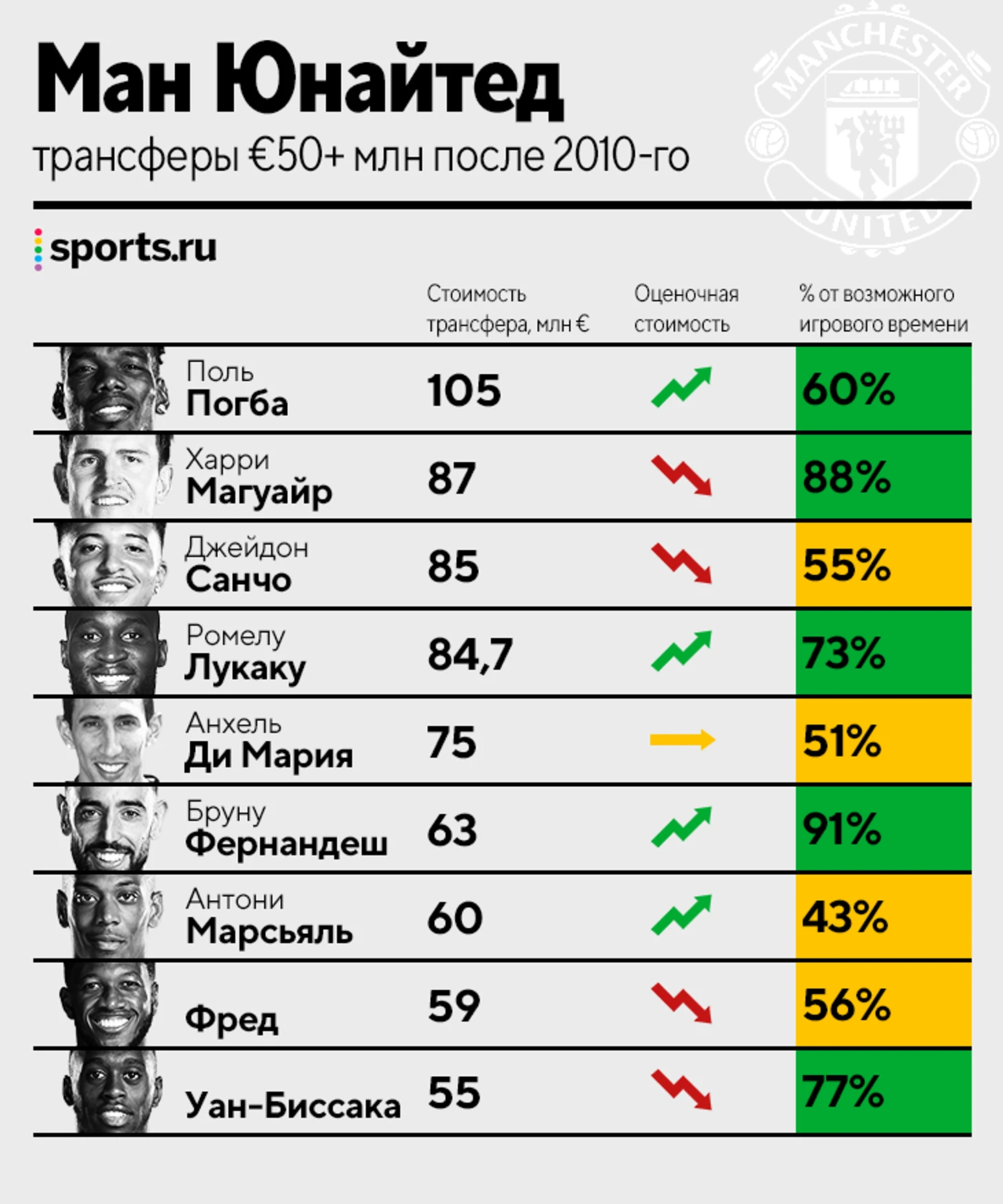 • Три трансфера из девяти сработали. Вы могли забыть, но Поль Погба в первые годы после возвращения был главной надеждой «Ман Юнайтед», в первые четыре года цена на него росла, скатился уже потом. Токсичные отношения всегда приносят проблемы на дистанции. Итог: не очень красивая история с не очень красивым финалом. Погба явно обижен на «МЮ», но, возможно, именно тут он провел лучшие годы карьеры. Не факт, что ему удастся вернуться на уровень 2018-го.