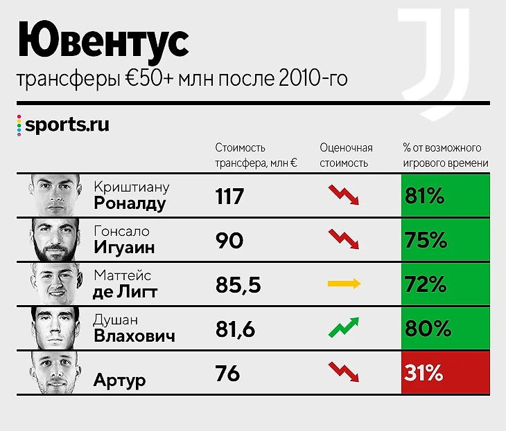 • Один неудачный трансфер из пяти – Артур каждый сезон выбывает минимум на месяц и вряд ли дает «Ювентусу» то, зачем его покупали.