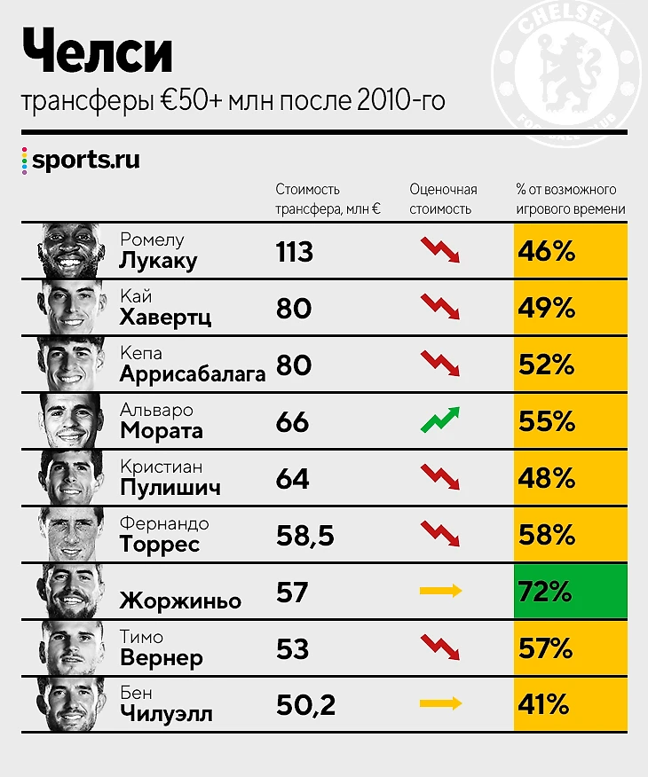 Из остальных настораживают трансферные результаты «Челси» (только один 100-процентно успешный трансфер из 9), но во-первых, мы все же разбирали только дорогие трансферы, а не все подряд (у «Челси» есть несколько успешных менее крупных сделок). Во-вторых, у некоторых футболистов (того же Хавертца) есть шанс на исправление.