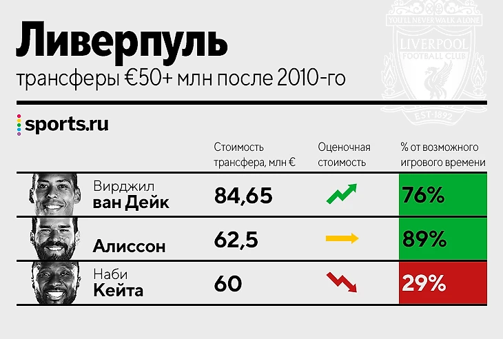 • Покупка Ван Дейка – одна из самых удачных сделок десятилетия. И обратите внимание, что защитник сыграл за «Ливерпуль» 76% от возможных минут, хотя пропустил целый сезон.