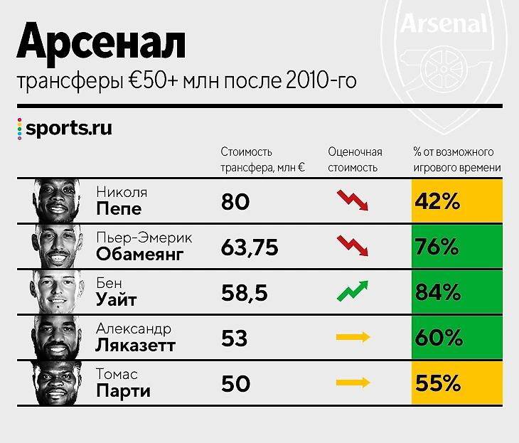 • Да, Обамеянг сейчас уже не воспринимается так, как в 2018-м, но в первые сезоны в АПЛ он забивал не менее 20 мячей и всю арсенальскую карьеру был основным форвардом. От него точно ждали большего, но неудачным этот трансфер назвать нельзя.