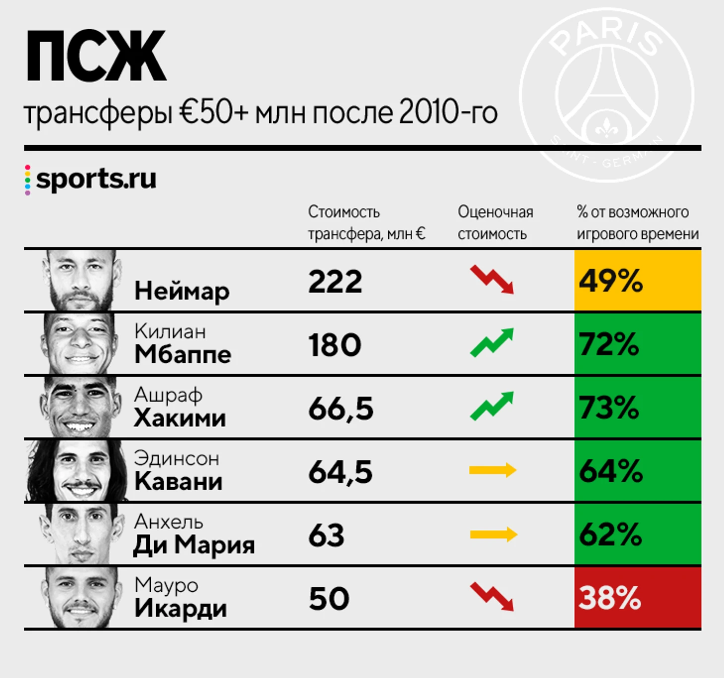 Оценивать будем по возможности четырехлетний период после трансфера. Если игрок не отыграл четыре года, то придется оценивать более короткий период. Отрезок больше четырех лет брать не совсем справедливо, так как игроки стареют и дешевеют. Например, Кавани уходил из «ПСЖ», заметно сбавив в цене за 7 лет, но разве можно говорить, что его приобретение было провалом? Первые четыре года в Париже получились вполне крепкими.