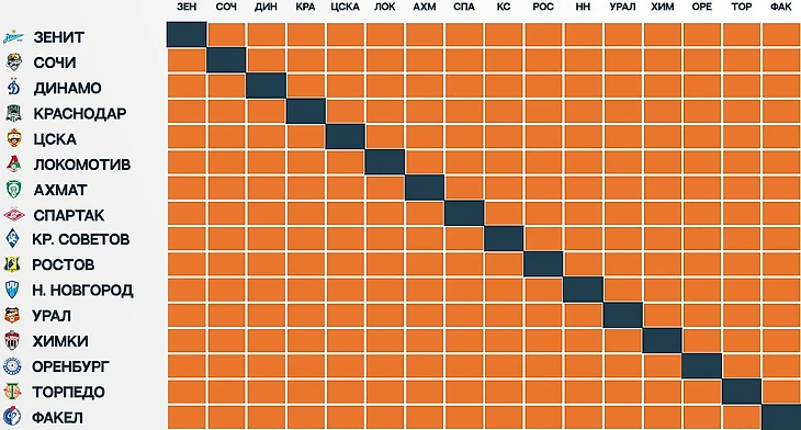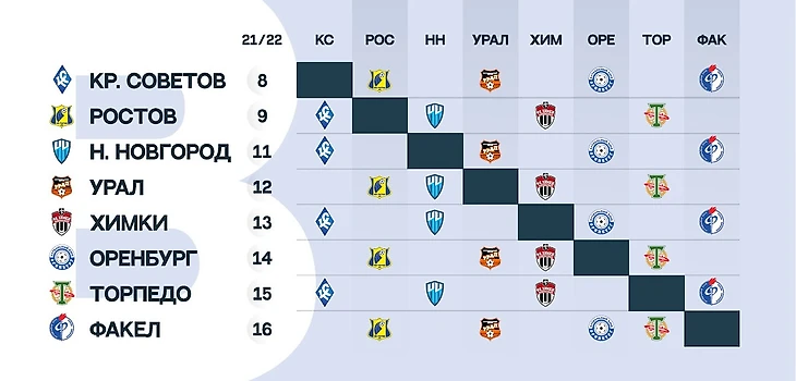 Соответственно и команды 13-22 между собой играют 4 круга (2 матча дома и 2 в гостях). А с командами из ТОП-12 они проводят в 2 раза меньше матчей (те же 1 дома и 1 в гостях).
