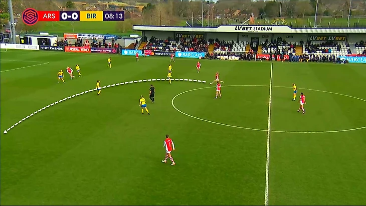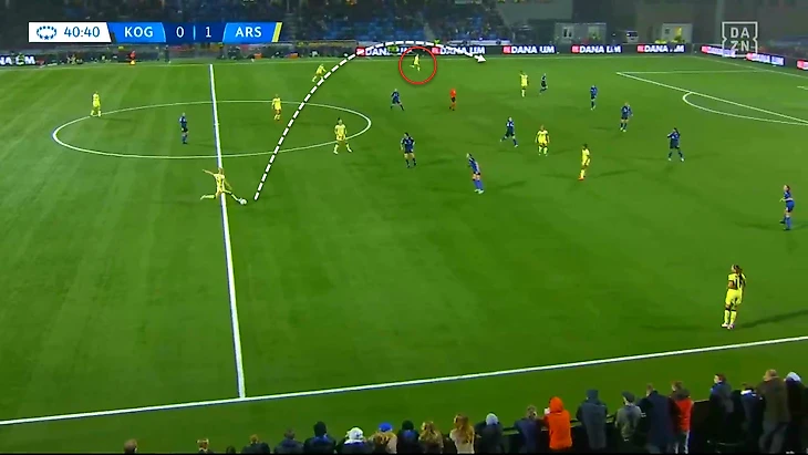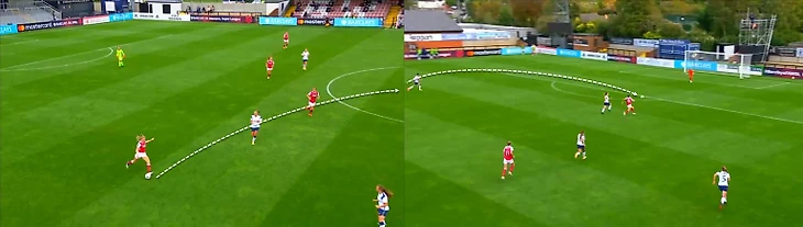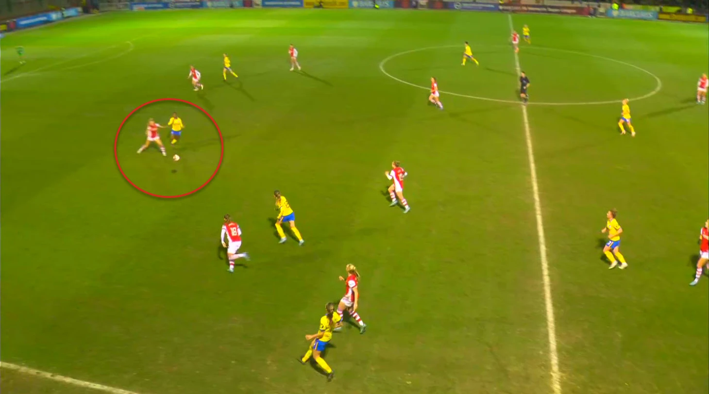 В этом эпизоде Лия выполнила успешный подкат на чужой трети, не позволив развить атаку сопернику. Это ещё раз показывает, что она может быть очень эффективна в высоком прессинге, когда стартует в полузащите.