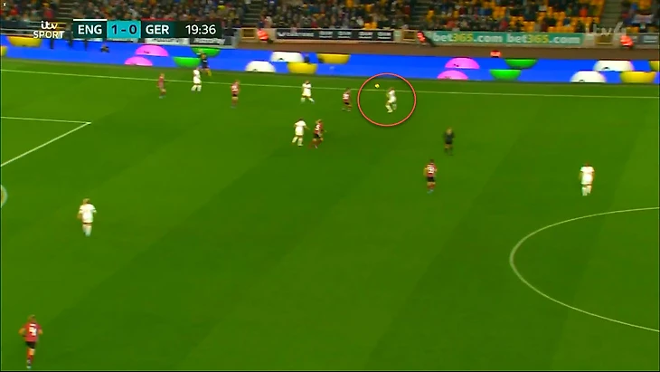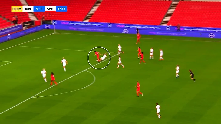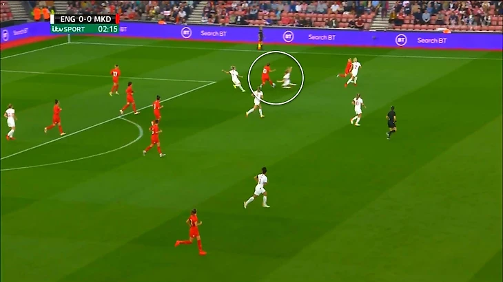 В этом эпизоде англичанка прочитала, куда защитник направит пас, своим движением обеспечила численное преимущество в зоне мяча и перехватила его ударом головой: