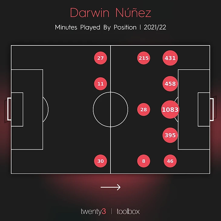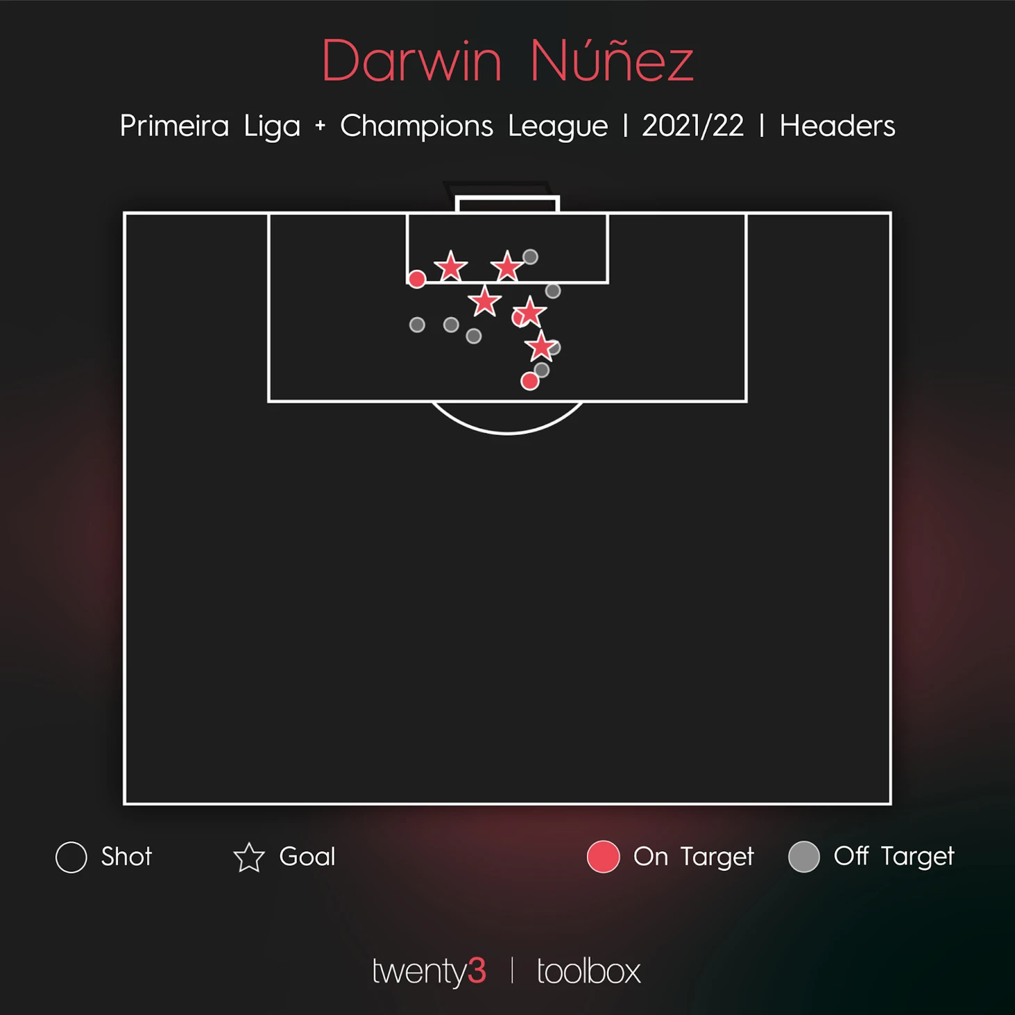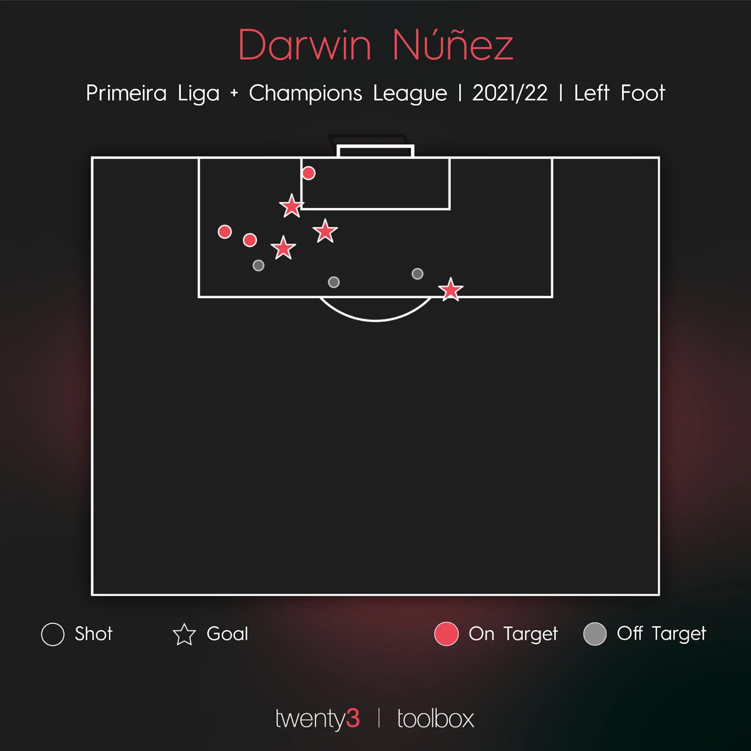 Нуньес наносил в среднем 2,89 удара за 90 минут в обоих турнирах в прошлом сезоне, и большая часть этих ударов, похоже, исходила с левой половины штрафной площади и лишь небольшая часть с правой.