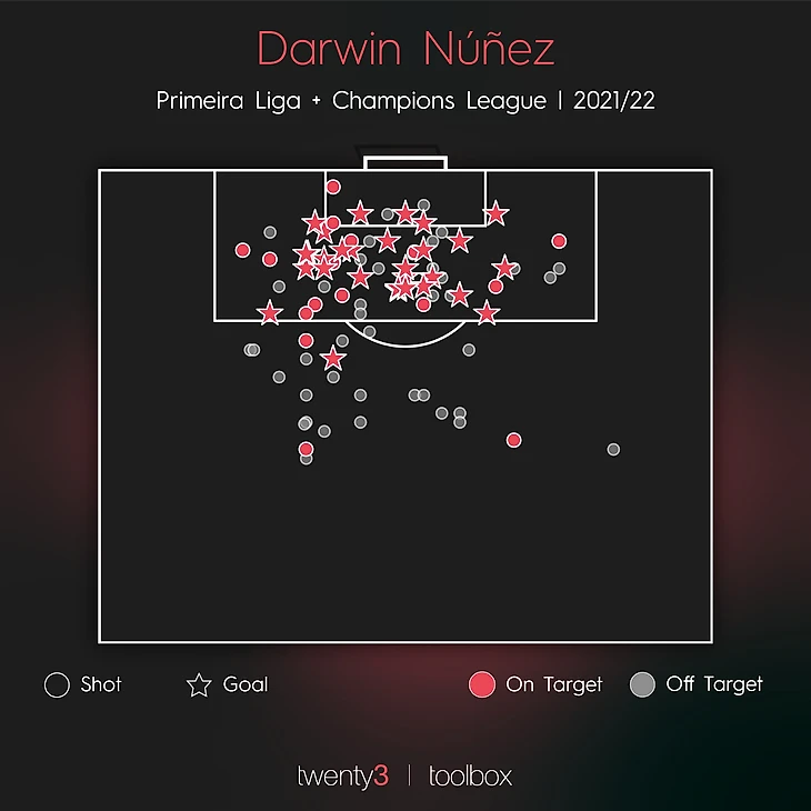 «Красные» наверняка полностью уверены в способности 22-летнего футболиста справится с шумихой и оправдать цену. Игрок сыграл 11 матчей за сборную Уругвая и оправился от серьезных травм. В 20-летнем возрасте Дарвин забил 16 голов в Сегунде за Альмерию, прежде чем Бенфика сделала из него самого крупного трансфера для Ливерпуля. После проходного сезона, в котором он забил 14 голов во всех соревнованиях, Нуньес поднял свою игру на новый уровень. В прошлом сезоне Нуньес забил 29 голов в чемпионате Португалии и Лиге чемпионов. Тот факт, что он забивал как и в лиссабонском дерби, так и в играх против Барселоны, Баварии, Аякса и Ливерпуля — не случайность, а показатель прогресса форварда. Тем не менее, мне бы хотелось немного углубиться в цифры этой голевой машины.
