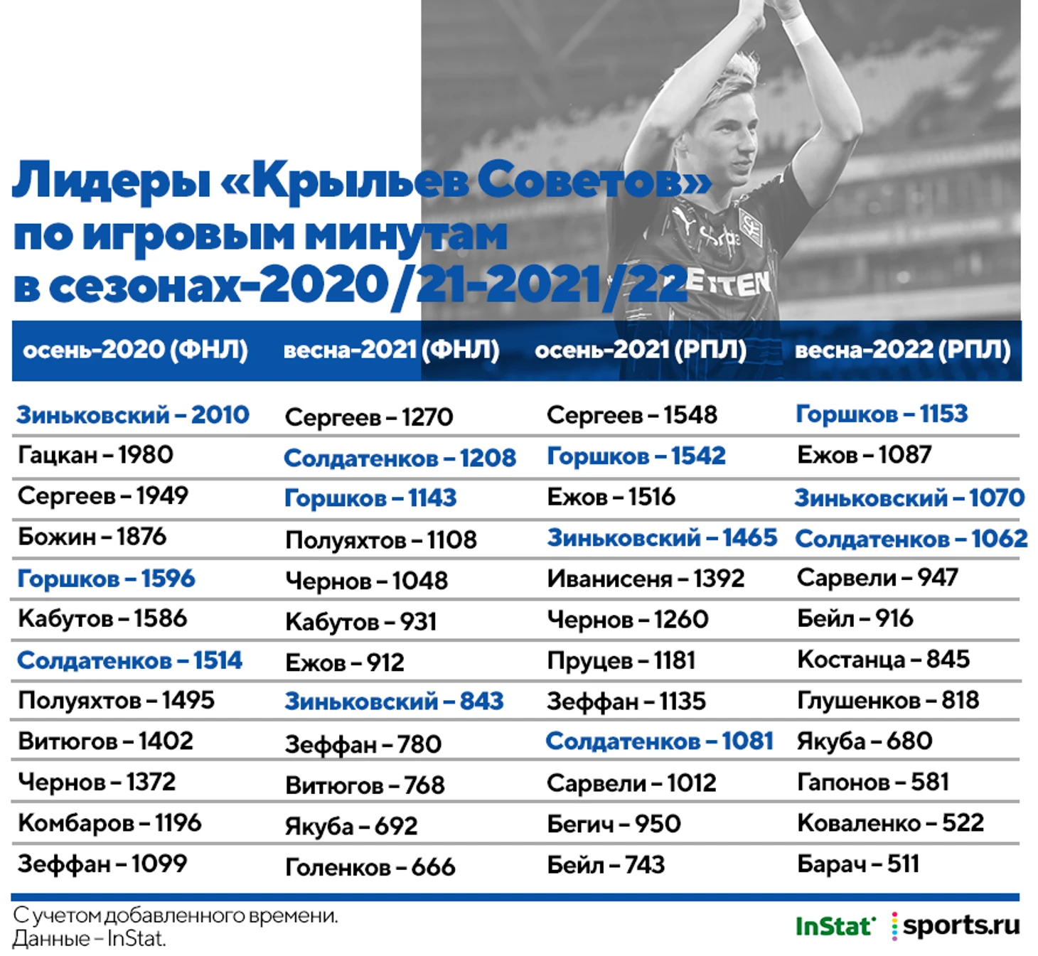 Данил Пруцев вернулся к Осинькину после неудачного сезона в «Сочи» – и быстро расцвел. В первой части сезона Пруцев был восьмым в РПЛ по продвижениям мяча в финальную треть поля, выше находились только игроки из топ-5, а по числу отборов Данил лидировал среди футболистов «Крыльев». Партнер Пруцева по центру поля, украинец Дмитрий Иванисеня, тоже был очень хорош на мяче. Зимой Пруцева подписал «Спартак», а Иванисеня покинул «Крылья» после 24 февраля.