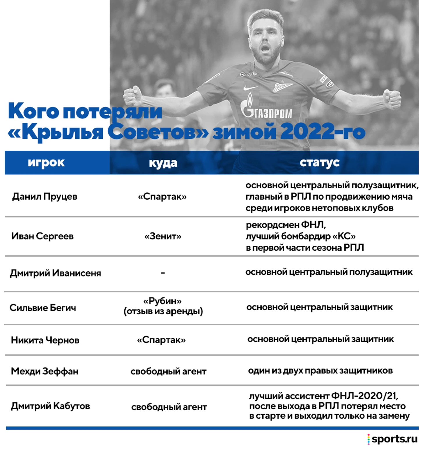 В середине прошедшего сезона «Крылья» потеряли важных игроков во всех линиях, кроме вратарской. Сильвие Бегич переехал в Самару в начале сентября 2021-го – и тут же превратился в лидера обороны, вытеснив из старта Солдатенкова. Зимой «Рубин» отозвал Бегича из аренды, а «Спартак» досрочно забрал Никиту Чернова – так разрушилась основная пара в центре обороны «Крыльев» осенью 2021-го.