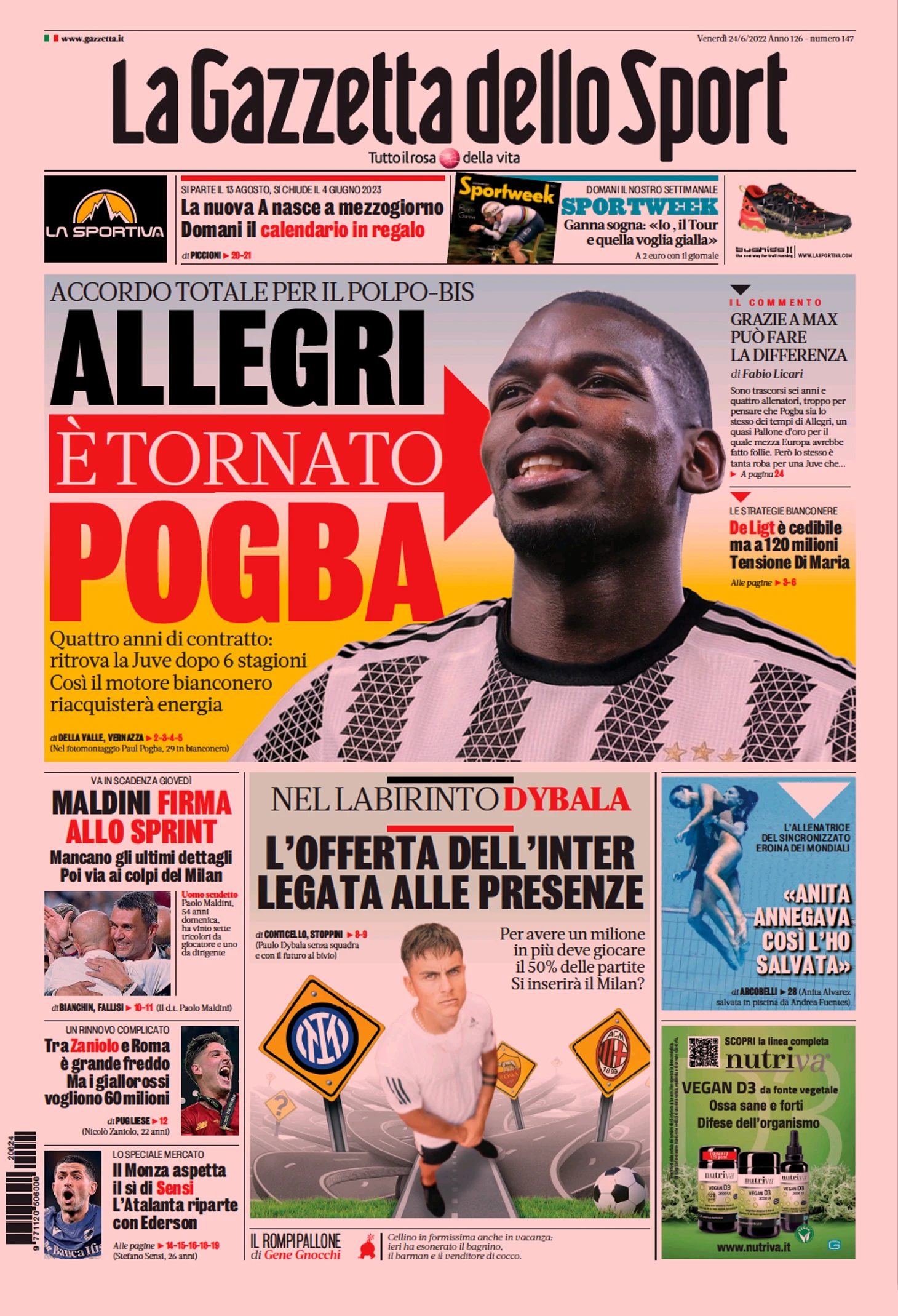 Аллегри, это вернулся Погба. Заголовки Gazzetta, TuttoSport и Corriere за 24 июня