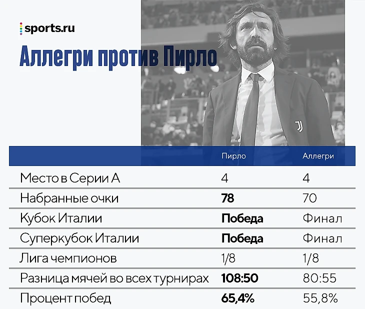 Аллегри меньше забил, больше пропустил и ничего не выиграл. Пирло ставил более инициативный и современный футбол