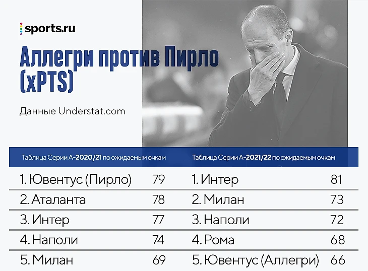 Еще сильнее Аллегри проиграл по ожидаемым очкам. Продвинутая статистика говорит, что в прошлом сезоне «Ювентус» заслуживал чемпионства – подвела реализация. С Максом туринцы не дотянули даже до топ-4.