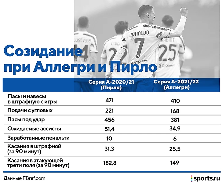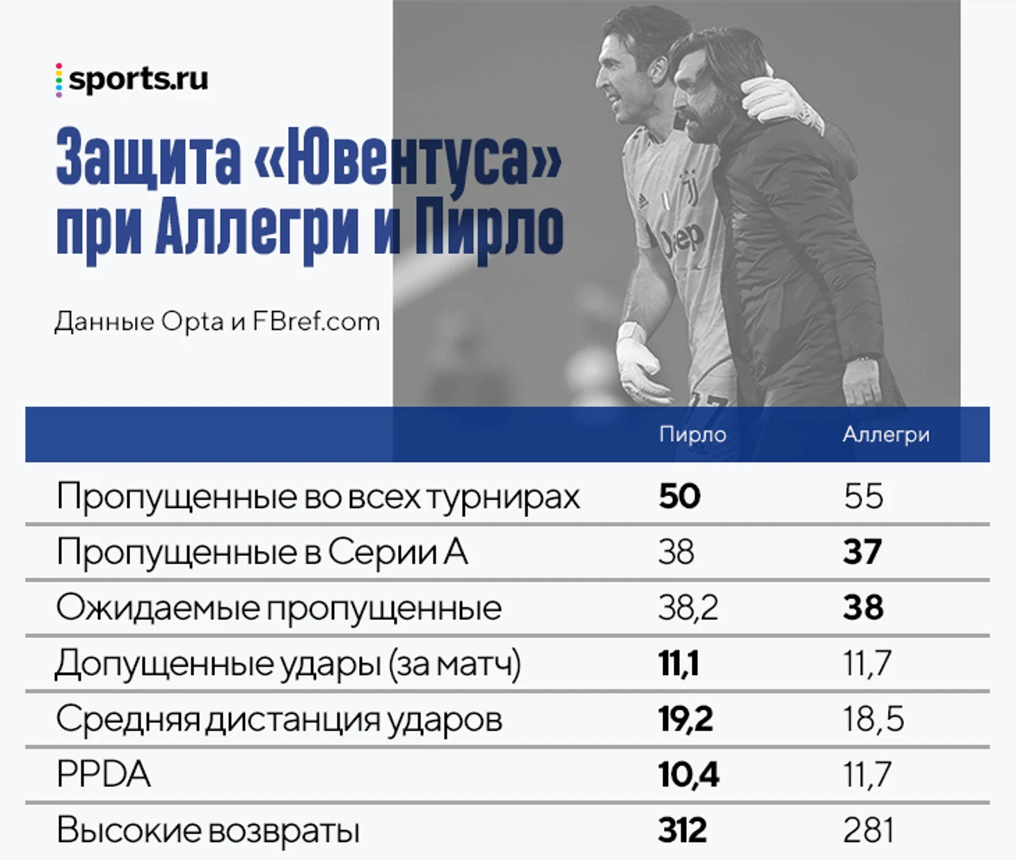 Андреа отключал большинство угроз на чужой половине: «Юве» активно прессинговал и закончил сезон в топ-3 по PPDA. Макс избегает таких агрессивных приемов. Его «Ювентус» реже применял превентивный отбор, больше времени проводил у своих ворот и соответственно множил риски.