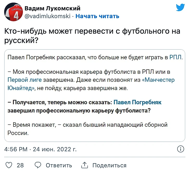 Затем Погребняк добавил: "Даже если позвонят из "Манчестер Юнайтед", не пойду, карьера завершена же". Тут стало сложнее – в первом предложении Павел говорил исключительно о российских турнирах, а теперь вдруг закрыл себе дорогу и в другие страны. Окей, получается, карьера совсем завершена, верно? Нет, подождите, есть еще и третье предложение. "Получается, теперь можно сказать: Павел Погребняк завершил профессиональную карьеру футболиста?" – спросил у игрока журналист. "Время покажет", – ответил Павел. ??? Как верно отметил Вадим Лукомский – кажется, без переводчика с футбольного языка на русский нам не обойтись.