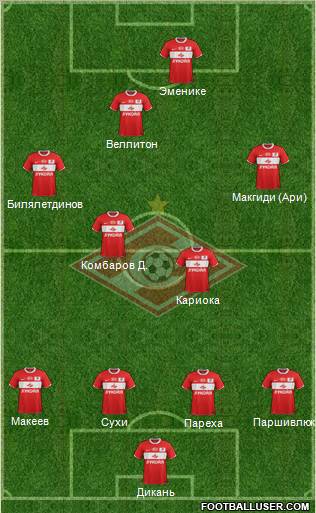 А вот то, что случилось во втором тайме, было, по-моему, интересно и, главное, почему-то осталось без особого внимания. Заключительные 30 минут, когда удалось переиграть Анжи и лишить их мяча (забудем про самый опасный момент Гаджиева), Спартак играл в 2 форварда – Веллитон чуть глубже, Эми на острие. Слева поочередно играл Билялетдинов и Комбаров, направо ушел Ари. Взаимодействие при данной схеме выглядело гораздо интереснее. Понятно, что это не рецепт победы, но может стать определенным козырем против не самых быстрых центральных защитников армейцев. Именно об этом говорил в программе «90 минут+» Василий Уткин, предполагая, что Спартак может сыграть в двух нападающих против ЦСКА. Вот так это может выглядеть в понедельник: