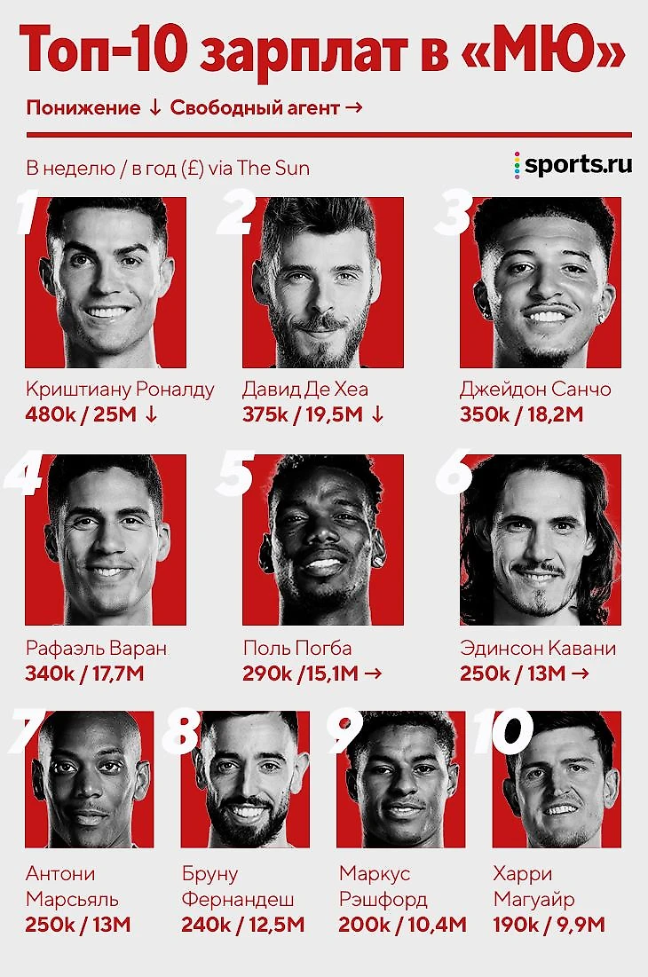 На двух звездах клуб сэкономит около 11 млн фунтов. Такое уже делали по итогам сезона-2018/19 («МЮ» занял шестое место): сократили, а через год вернули. Окей, а как выглядит десятка самых больших зарплат команды?