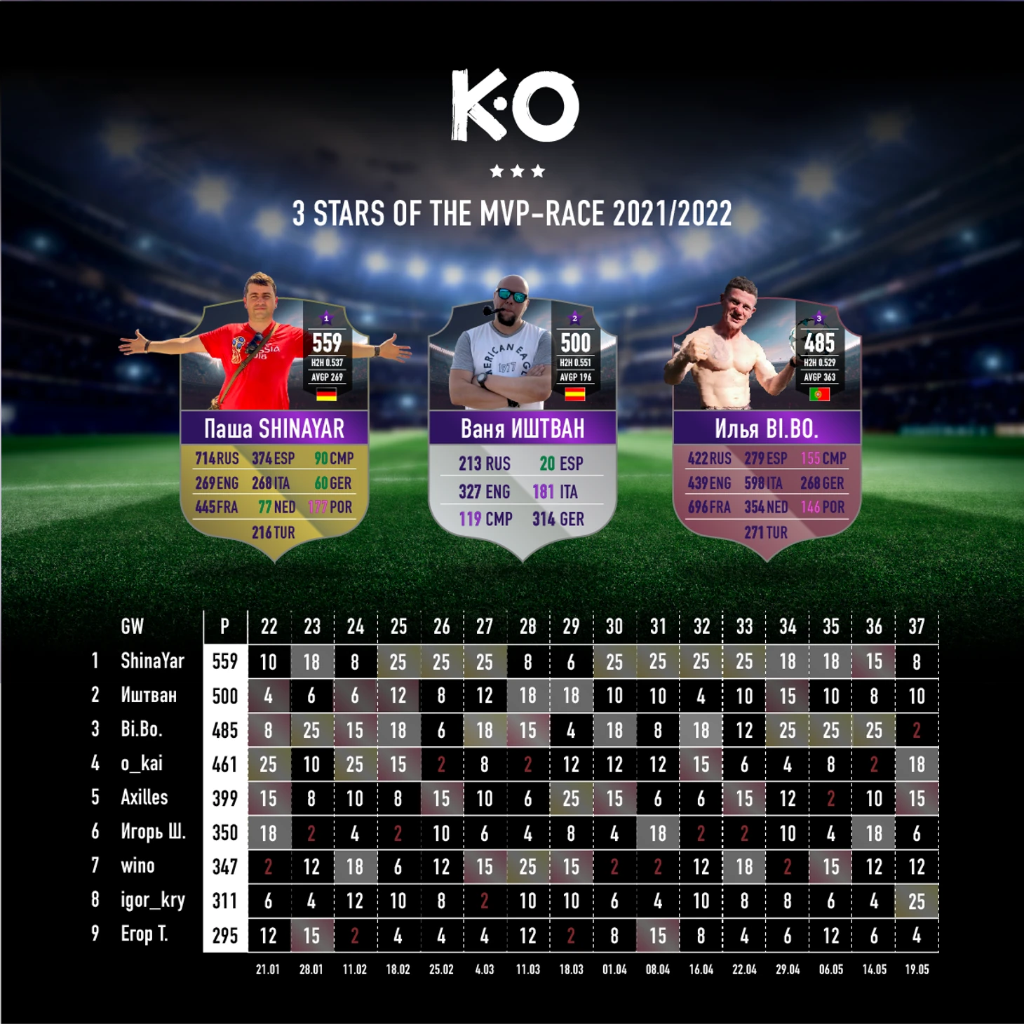 В сезоне 2021/2022 для внутрикомандного огня и усиления соревновательного принципа среди игроков Коменды мы запустили MVP-гонку, которая по окончании сезона должна была определить фентези-лидера команды в сезоне согласно набранным очкам.