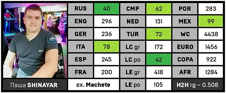 Шех — батя. Совмещение всех оффлайн направлений деятельности в одном лице на уровне грандмастера, поэтому опытным путём вывел стратегию «состав за 3 минуты перед дедлайном» в еврокубках на новый уровень — топ-1% тура в лёгкую. Самый большой скачок в результате по сравнению с прошлым годом — испанский Шех с 1К+ до 156 в оз. Аналитический склад ума обещает повсеместный прогресс в игровых турнирах, лишь бы найти свободные 3 минуты.