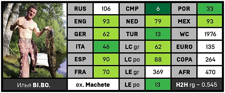 Илья /Bi.Bo./ — он же «Билли Бонс». Скауты Коменды выстрелили дуплетом и подписали ещё одного из оригинального состава легендарного «Мачете». Невероятная удача захантить такого сверхопытного игрока с почти полностью зелёной таблицей — только по несчастливой случайности Илья ещё без звезды. Ходят слухи, что втихаря болеет за Торпедо Москва. Ильич абсолютный фентези-мультиинструменталист — замечен даже на ESPN NBA и фентези Формула 1. Два года был без команды — добро пожаловать на Коменду. В команде будет за страшилки мышцы.